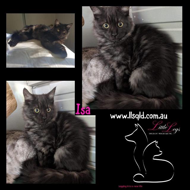 Isa is an exquisite, smokey black girl who is extremely sweet and gentle. She can be shy when she first gets to know you but as she learns to trust you, she blossoms into an absolute lovebug who demands pats and head butts.