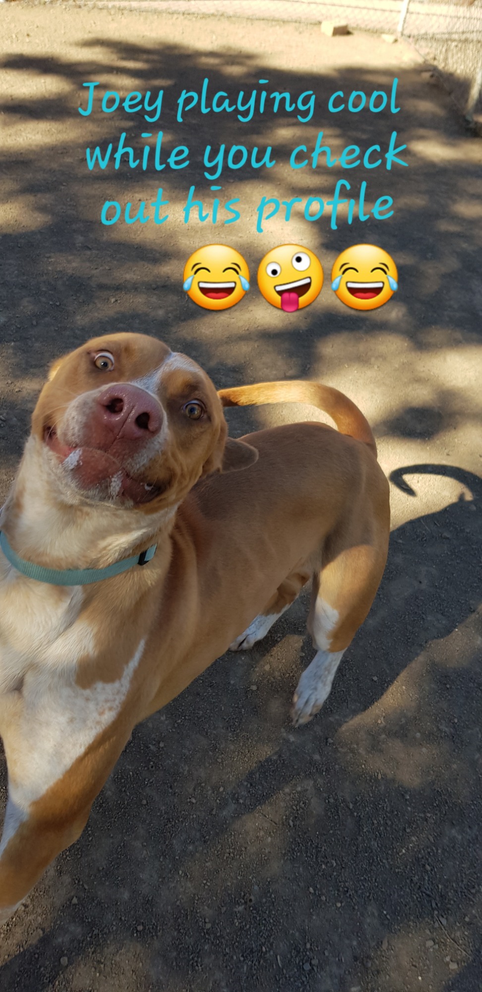 Joey is a real character who loves to play with other dogs. Joey is cat friendly but should still be supervised. He really loves his human friends and likes to please. He can sit on command and is good on the lead. Joey has no food aggression. He's a super smart boy who will love going for walks and being included as part of the family. He is simply the best boy and will be a great dog to have.