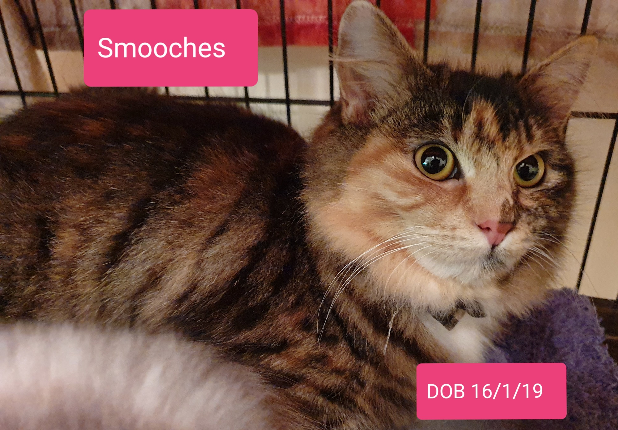 Introducing Smooches the young cat by name and nature. She is a domestic medium hair torti cat that starts to purr as soon as she spots a human.