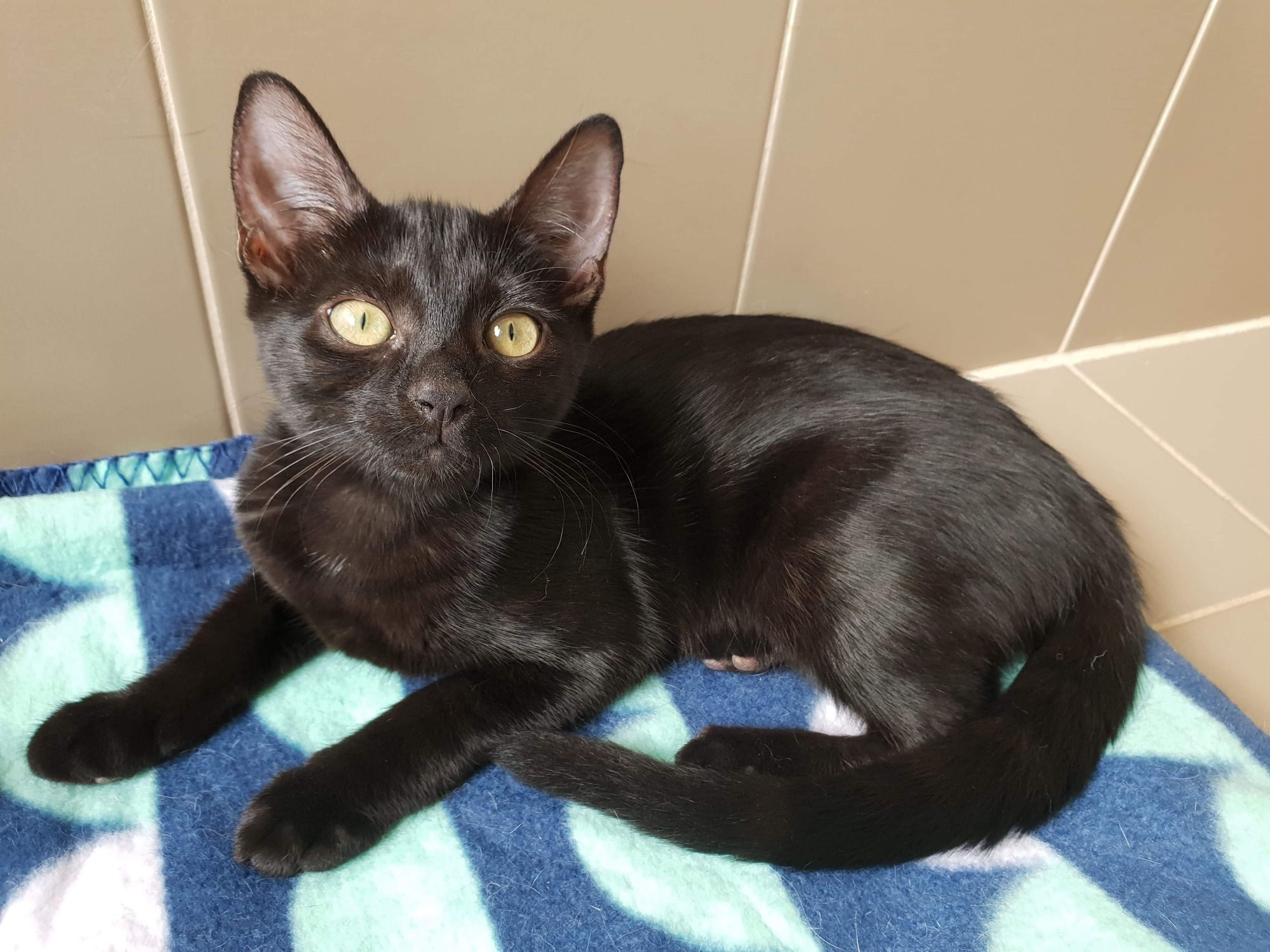 Meet Cricket she is 12 months old. She is unbelievably affectionate and rates pats almost higher than anything else in the world...food is very close though and sometimes it’s a little higher. A stunning black girl with astonishing green eyes she is as pretty as a picture. She loves a chat and often just chirps away . She is the head-bump queen and loves to be wherever you are. Not the best with being picked up but she is getting more comfortable with it over time. She has settled in and has found herself to be quite cat friendly. She has no problem with young children - if they can pat her then she loves them. Her ideal home would be with someone who can give her lots of affection and good food and doesn’t have too many other cats or dogs to contend with.