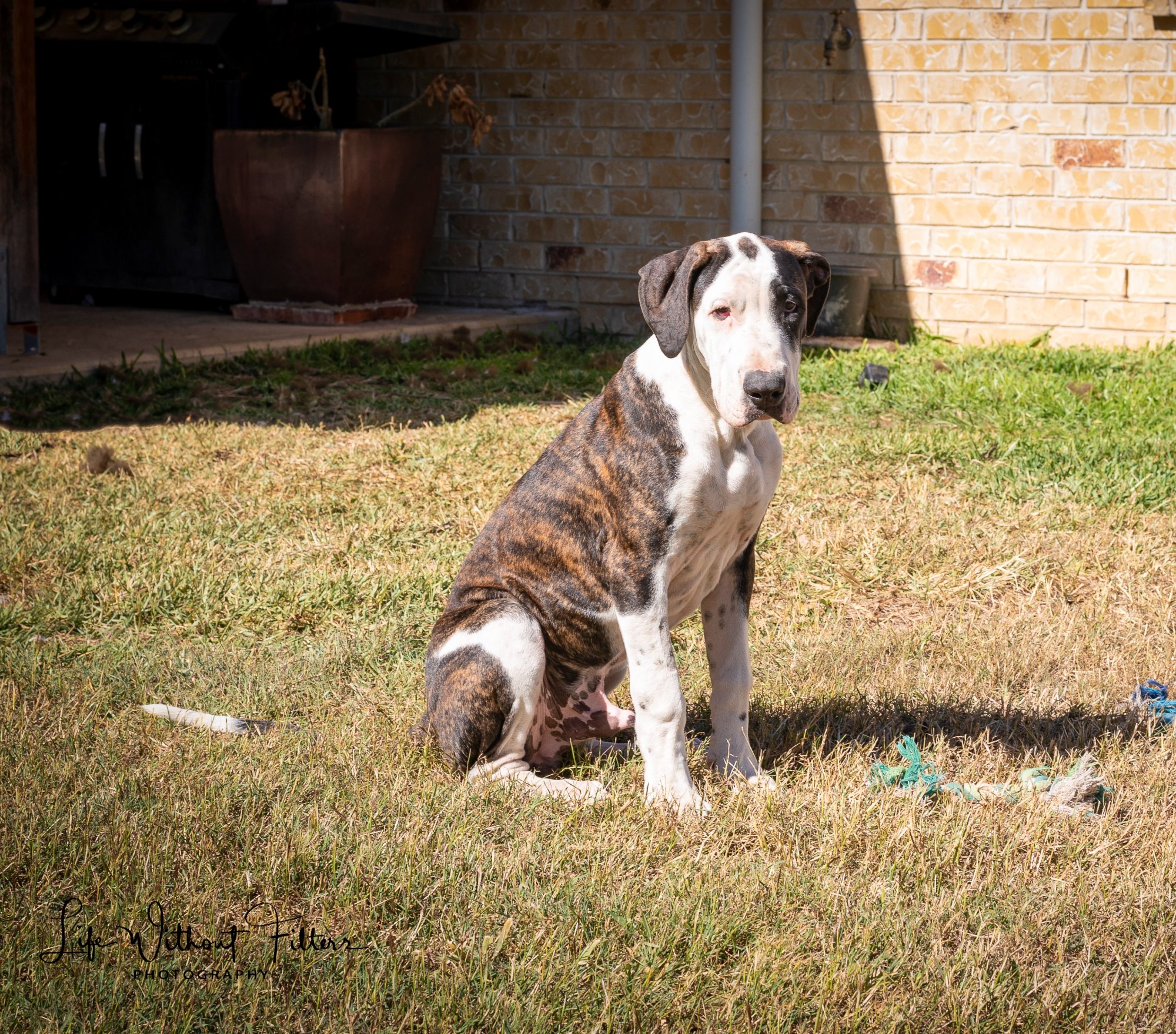 Zac is rather chilled, content to watch what's going on from his bed. He is slowing learning not to jump up, so would probably suit older children until he masters it - he is good with our six year old. Zac is submissive so there were no issues introducing him to our other, larger dogs. Judging by the size of his paws and his excess skin, he will be a very large dog, which won't be a problem when he is so gentle. Zac is more than happy to be an outside dog. Zac is so relaxed and has never barked and really deserves a furever homes