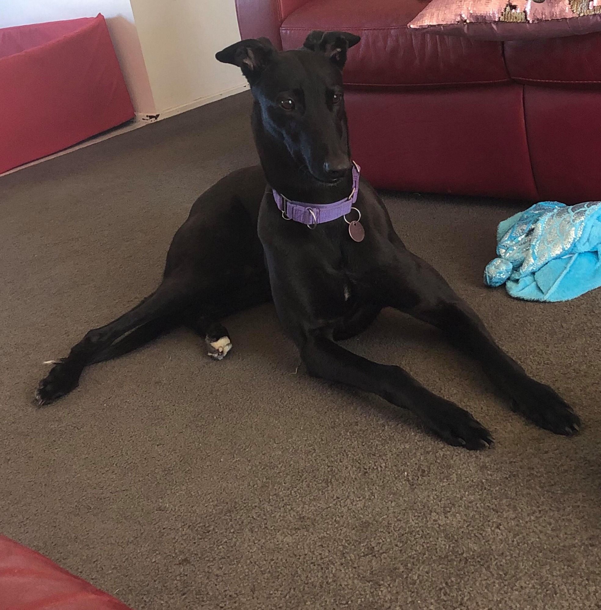 I've been living with my trainer since I finished my career. And recently I was dropped into foster care, they have these funny little white dogs here called Bull Terriers, I live indoors, but I do run around with them. I play with the 7 month old Bull Terrier puppy and he jumps all over me, it's the best fun. In saying this, I am not accustomed to cats so will not be able to live with them.