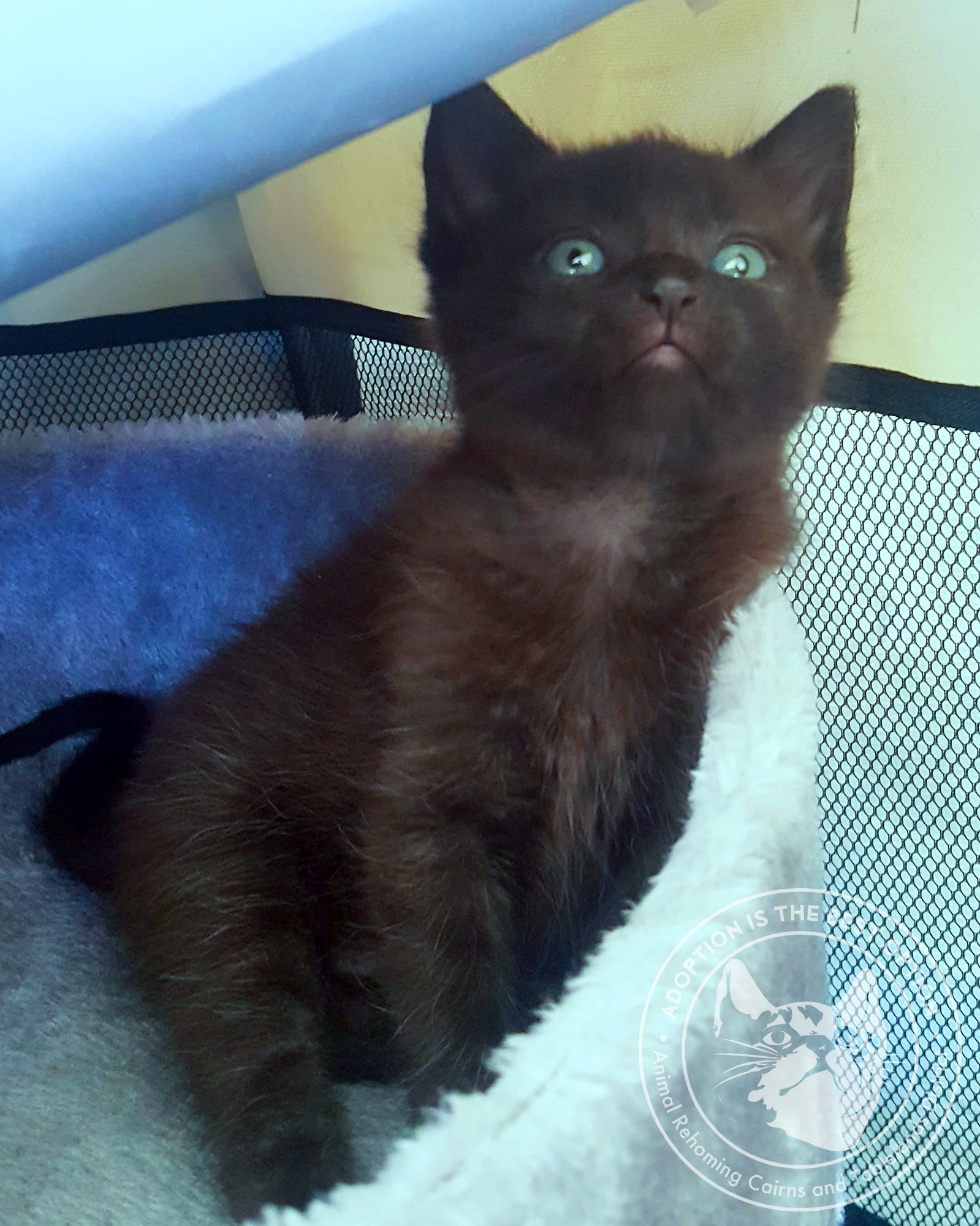 Kiwi was born on 17.06.19. Kiwi is tiny but, what she lacks in size she makes up for in personality 😊 Currently sporting a beautiful ghost-tabby pattern through her coat, when she catches the light she's almost a dark chocolate stripe ♡ A real slinky malinky, she's into everything, loves her food and loves attention/affection - has a real big purr for such a little kitten ♡ All her vetwork will done prior to being adopted which includes desexing, microchip, vaccination, flea and worm treatment. If you're interested in adopting this baby, please click on this link to complete our application form: https://form.jotform.co/91463029063858