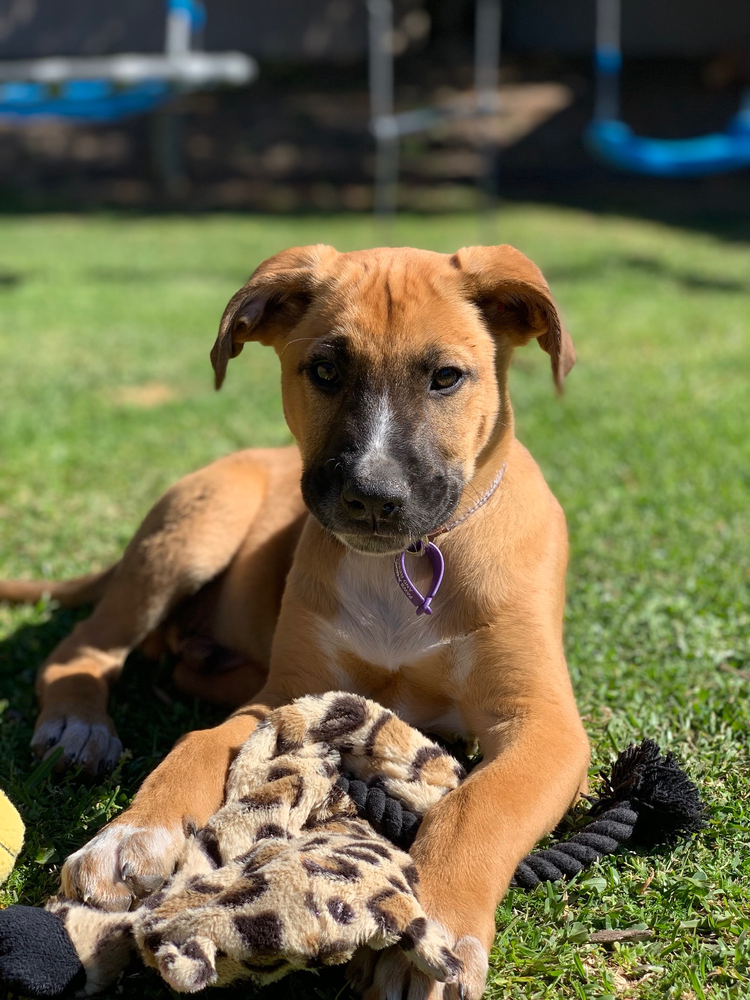 Simba enjoys rumbling with his host kids and playing with his toys and pleasing his humans.