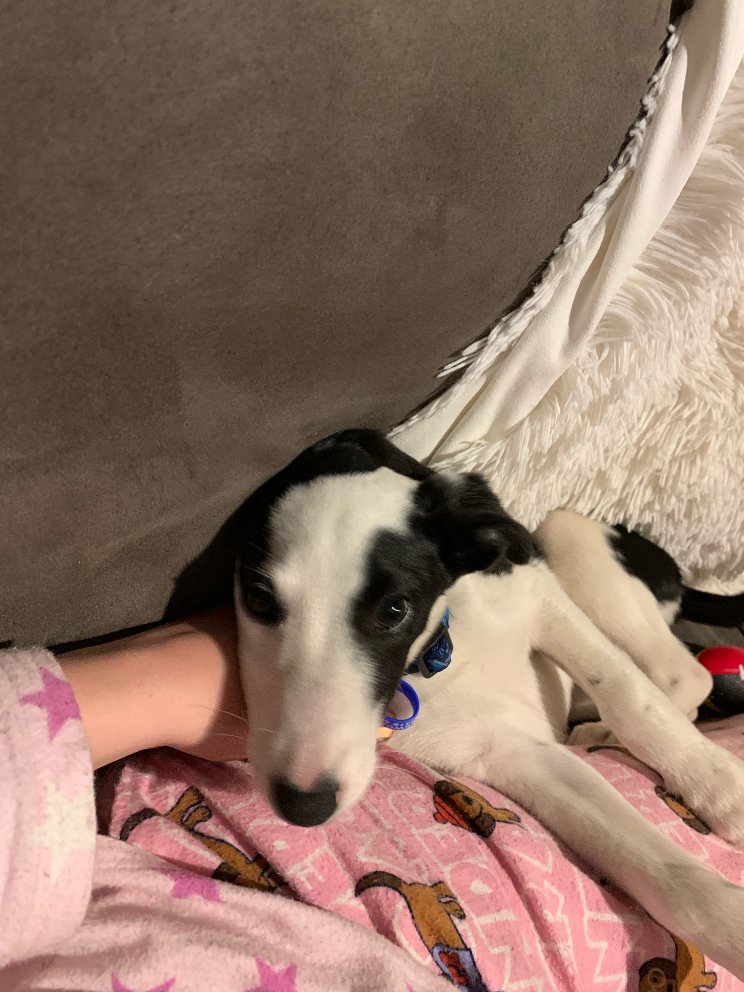 Molly is great with babies and young children and will be a wonderful family dog! You will need good fencing with no small gaps as she is very slim and can slip through gaps, even baby gates!