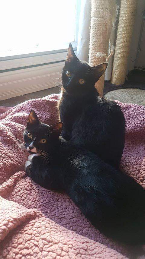The adventurous friends Pepper (black) and Jules (tuxedo) were both born early his year.