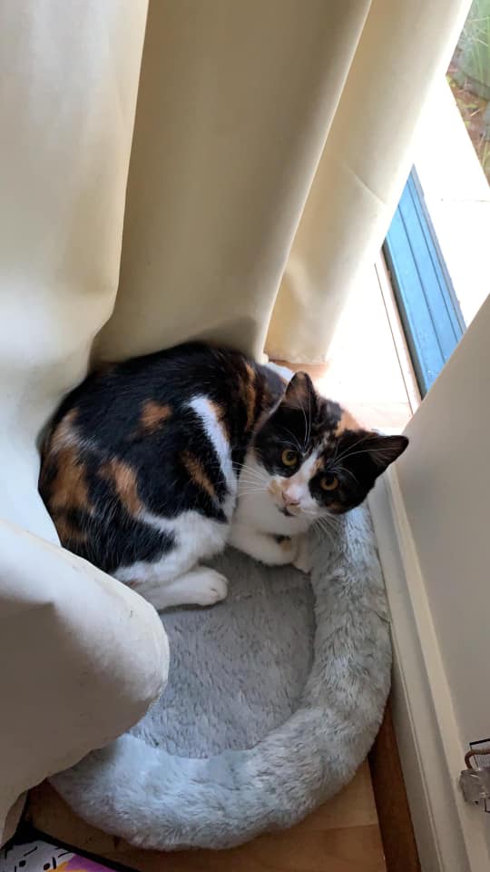 “After two months in my home and a lot of patience, Penny is coming out of her shell, and is a very playful and cuddly cat. She is okay with being handled after interacting multiple times a day. You can pick her up when she’s relaxed and she enjoys the cuddle (especially if a fluffy blanket is involved)! She is very curious and loves to know what you are doing at all times, and is very demanding when she decides it’s dinner time or cuddle time! Penny would benefit from a quiet home with no children, and would make the perfect companion for a single person or a couple. It will likely take her a while to adjust to a new home, so patience is key. She has had the run of my home and made it quite her own. In the beginning this meant that she had lots of spots she felt safe - in her case she loved hiding behind the curtains, and then zooming around playing at night when she is undisturbed. She is not sure how to play with humans yet but is quite happy playing alone with her toys (and my shoes and socks and hairties!) and will tease you into thinking you can catch her! Once she settles into your home she will make a very loving and loyal companion who will amuse you endlessly with her antics, and seduce you with her very loud purring!”