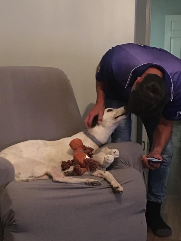 Samuel's happy tail is a little shorter than the usual greyhound tail.