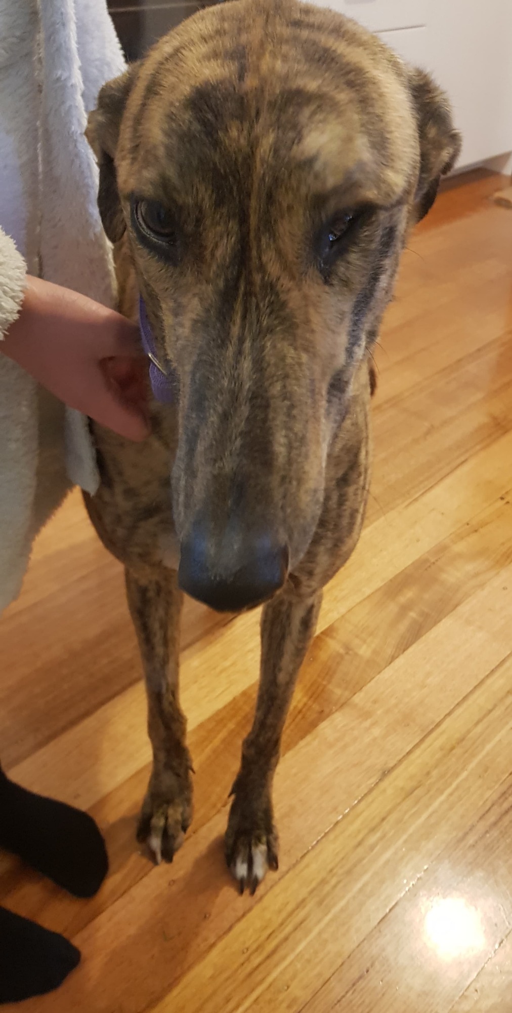 This tall striking Brindle girl is so wonderfully affectionate, she makes you think you're pretty special.