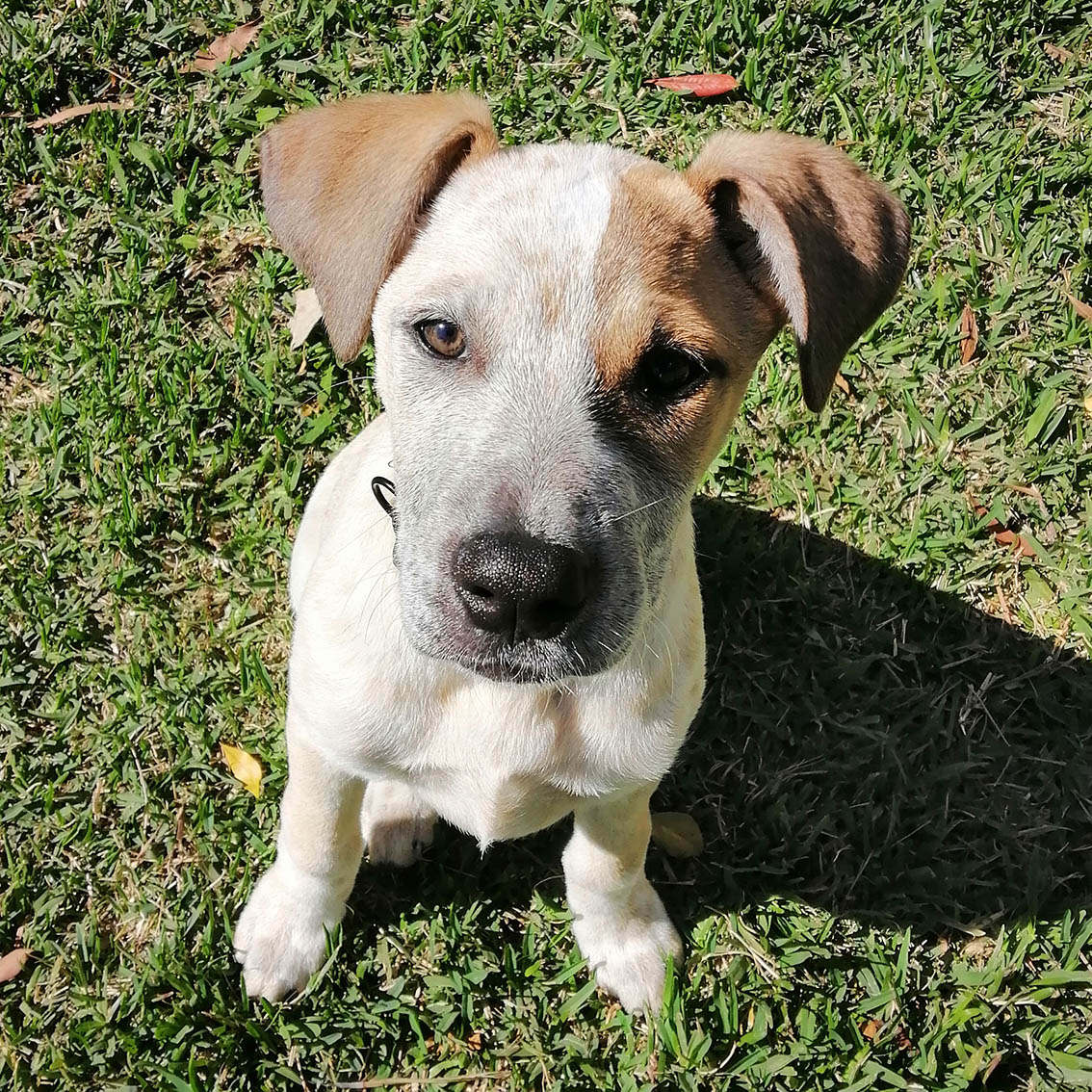 Daisy is a beautiful 14-week-old cattle x puppy. She loves snuggles, food, and has shown great promise with training. She is a little shy initially but is starting to be brave and plays with her much bigger foster brother.