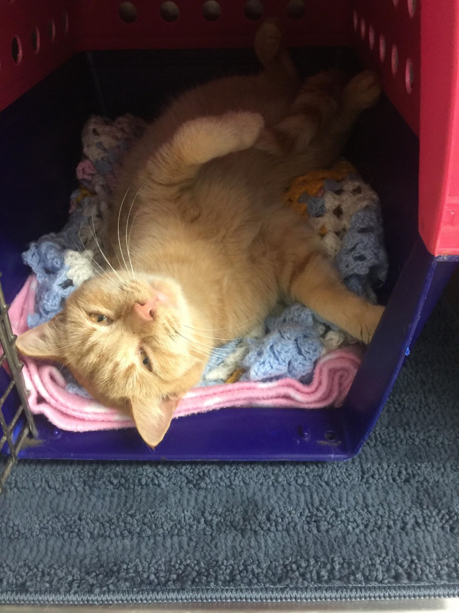 Hello my name is Garfield and my foster mum said I’m super special. I’m a domestic short haired ginger spotted tabby male cat.