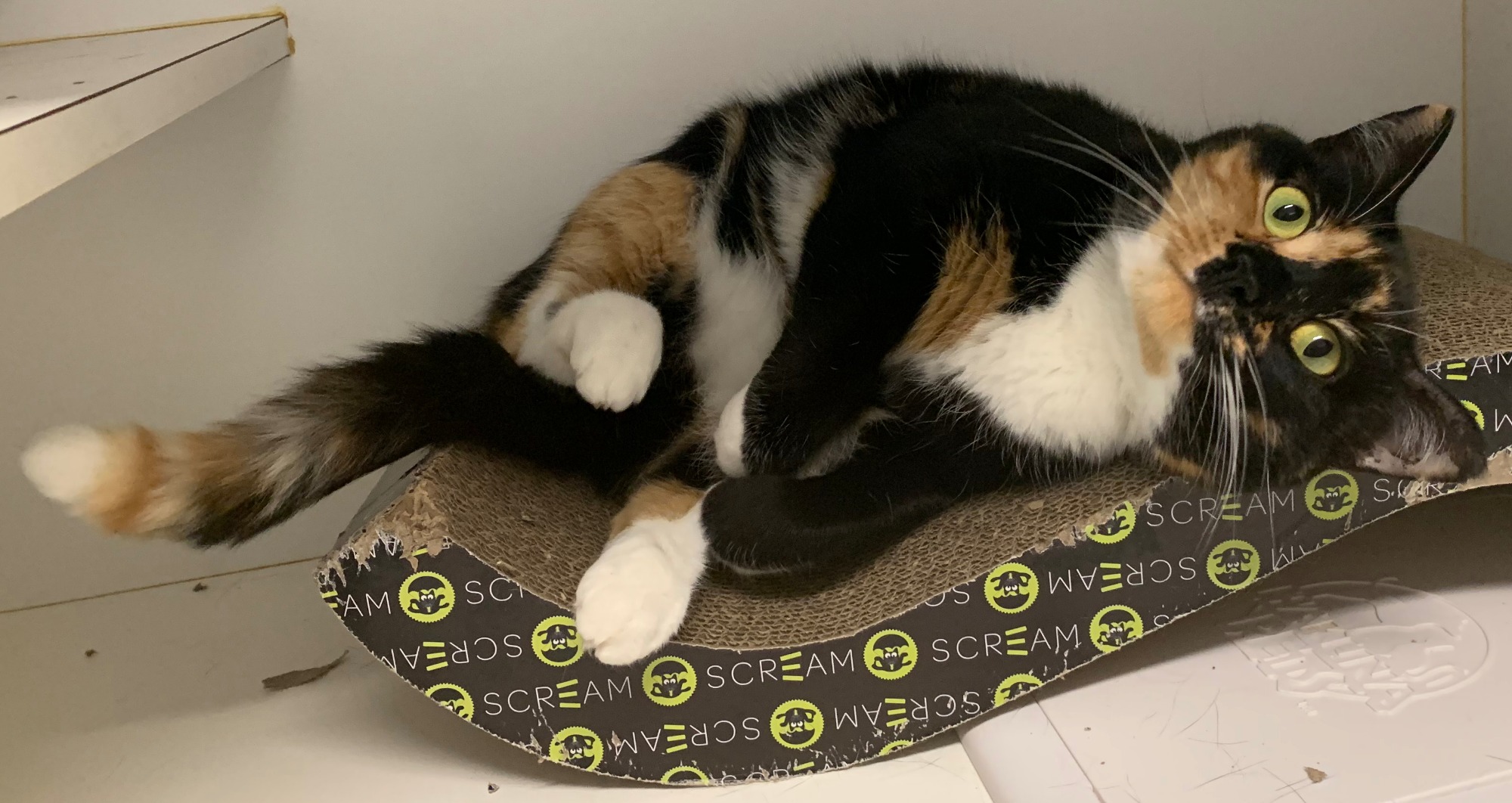 As you can see she likes to lounge on her cardboard scratcher which she uses like a bed!