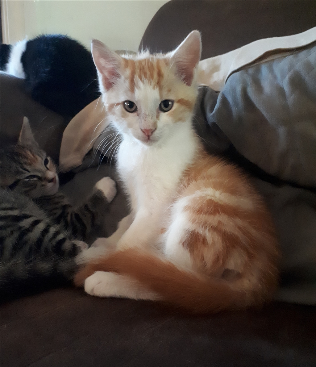 Paddy loves chasing games with his sisters, using his playpen as a trampoline/trapeze and just generally having fun. All this leaves him pretty tired and his favourite place to curl up for a nap is on the arm of the lounge where he will purr himself to sleep.