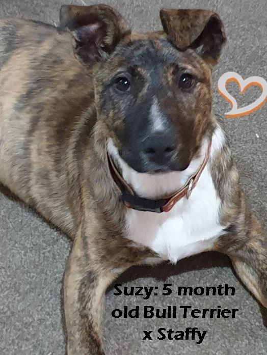 Suzy: 5 month old Bull Terrier x Staffy. What an adorable and loving girl our little Suzy is! She is very adaptable to all situations, making her close to being an ideal dog. She is good with children of all ages, absolutely adores other dogs and her adult humans.