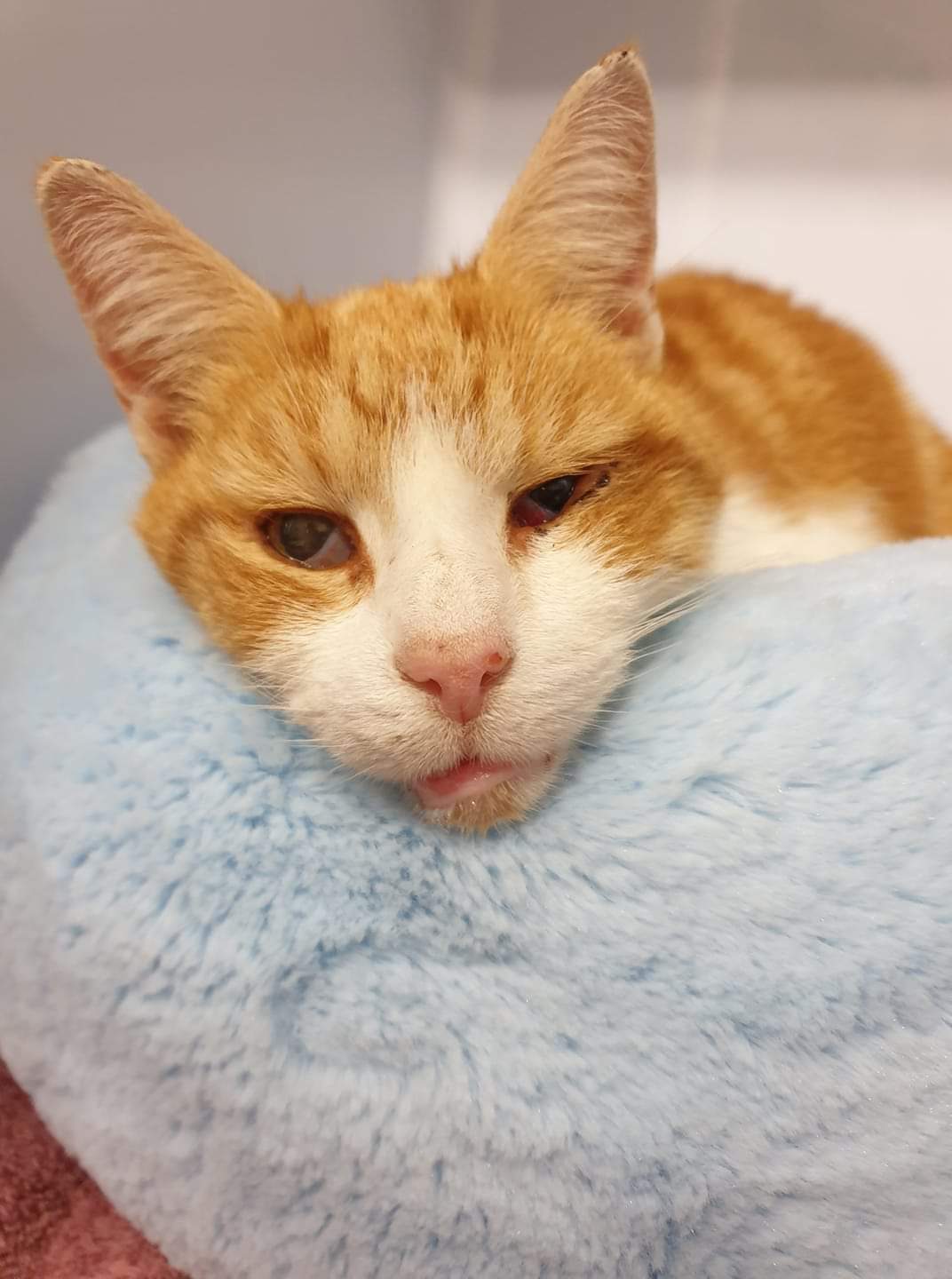 Celia has had her left eye removed due to having a tumor on the third eye lid. This was sent away and the results returned as a Haemangiosarcoma. This is a malignant tumor but one that very rarely spreads to anywhere outside of the area it was found in the eye. By removing the globe of the eye we were able to remove all of the tumor with clean margins giving Celia a great prognosis. She has had the tip of her left ear removed due to also having a tumor, which came back as a benign sun spot. She has had multiple sore and infected teeth removed and the rest of her teeth cleaned up. She has been FIV tested (negative) and had a full blood panel run.