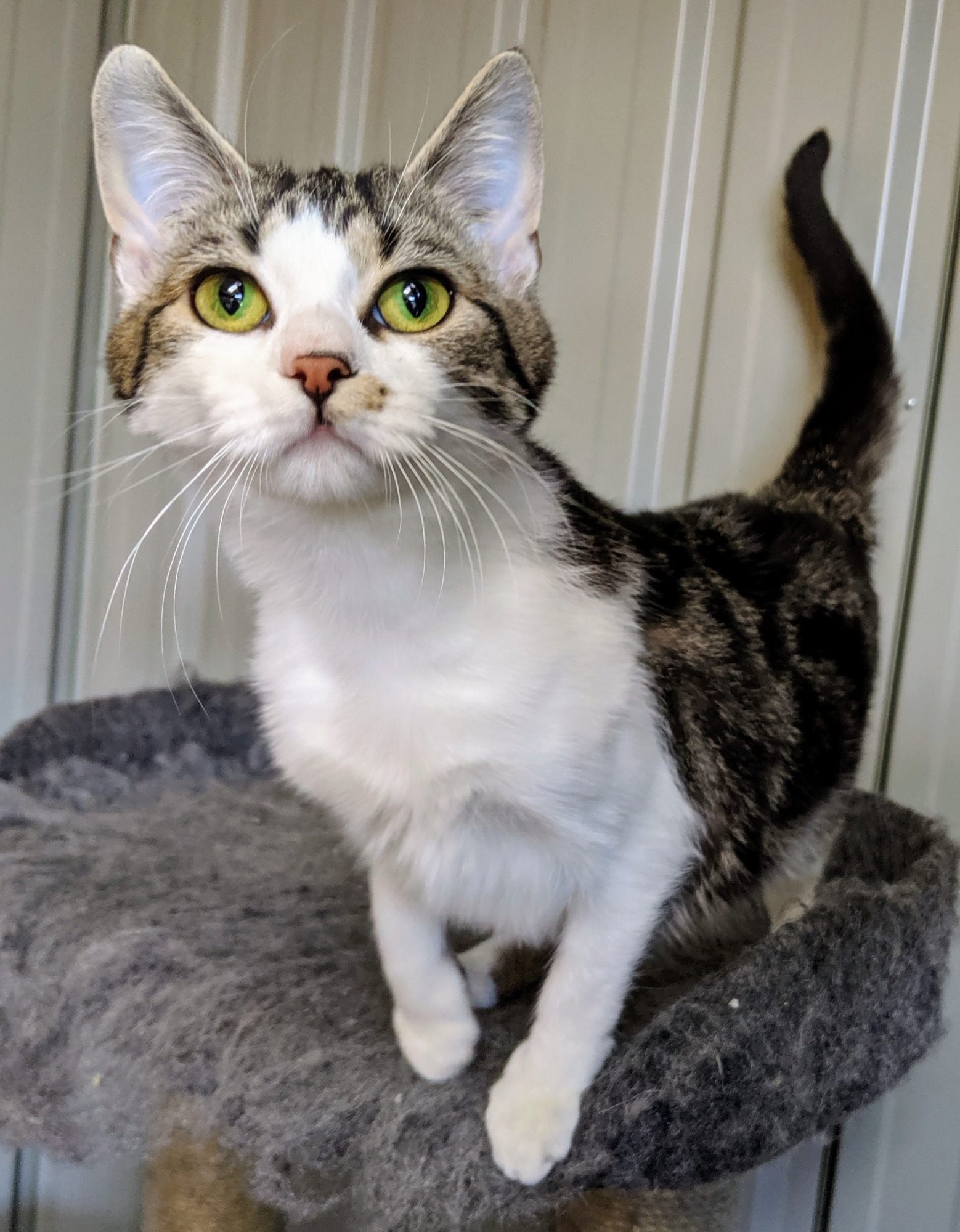 Hi I'm Cricket. I came into foster care after being hit by a car at 3 months old. I was very skinny and had leg and neck injuries, which have both healed now (my fur is still growing back on both). I am a beautiful, smoochy, friendly, playful girl who has a BIG purr, loves to talk to you with trill noises and rub against you. I currently live in foster care with other cats, dogs and children of varying ages and love to run and play with all of them. I just love to be with you and will talk to you and call to you for attention. If your busy I'm happy to follow you around the house supervising what your doing. I am an INDOORS ONLY kitten (please be careful with open doorways or windows because I may try to wander), but I love it best there because I feel safe and love being near my family.