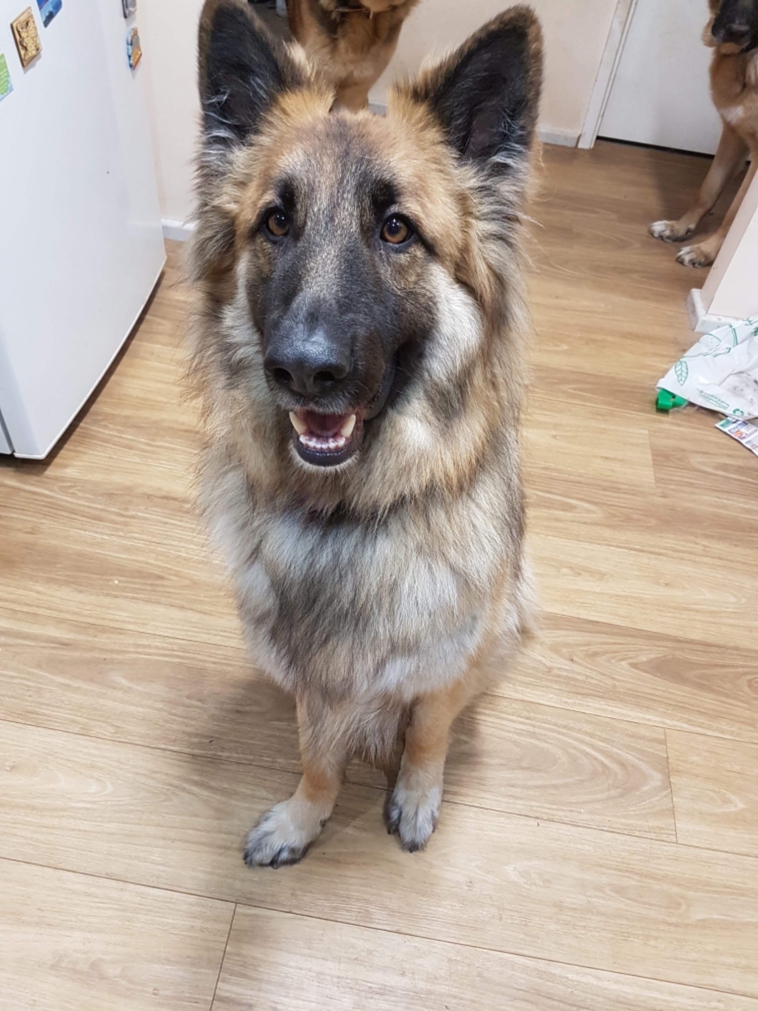 Sharing his foster home with his fellow rescue shepherds Diesel has learnt to be part of his human and fur family.
