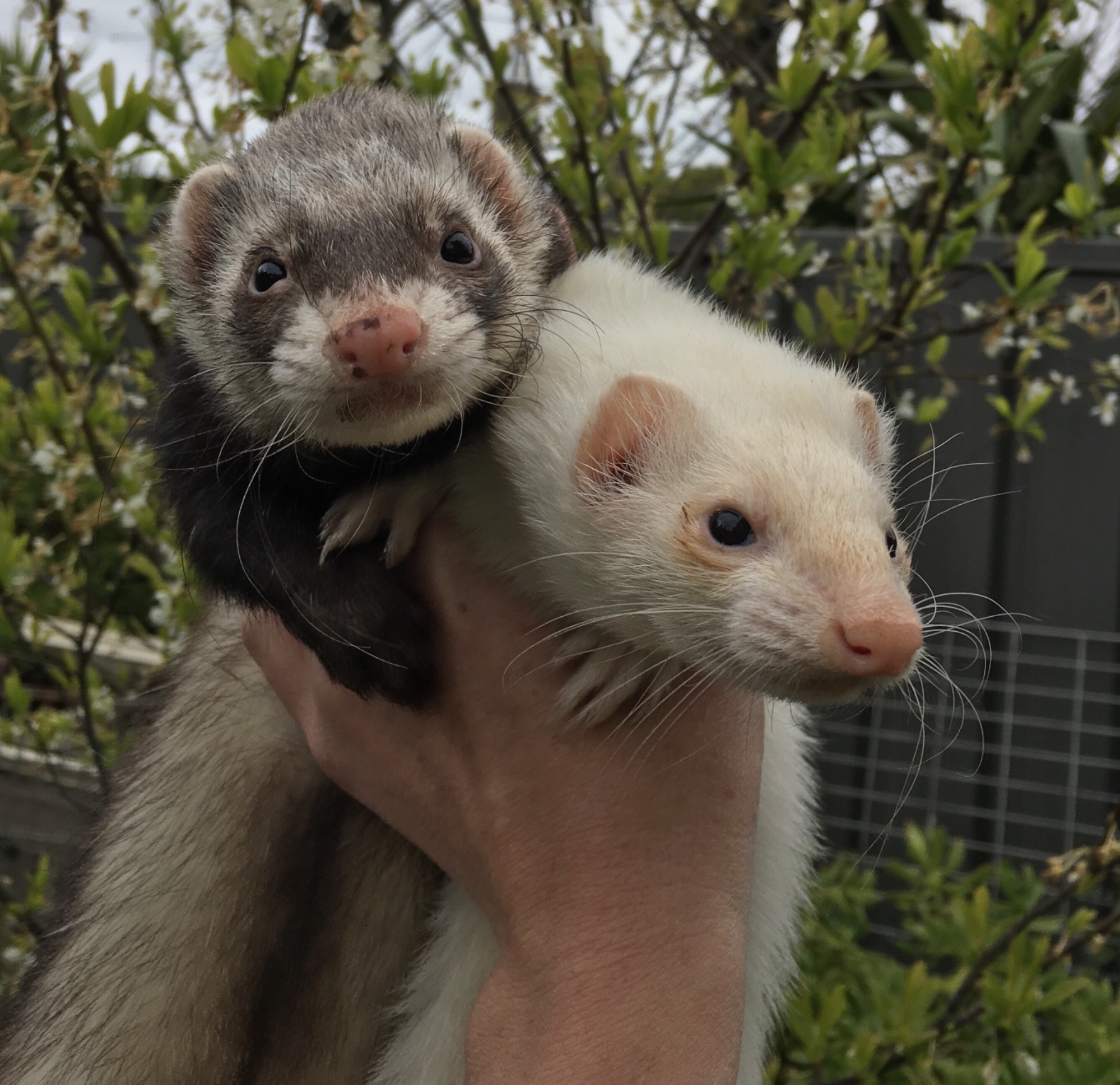 Bonded pair of older fuzzies. Both very easy to handle and interact with. Get along with other ferrets fine. Yoshi is 6 & Ruby is 5.5