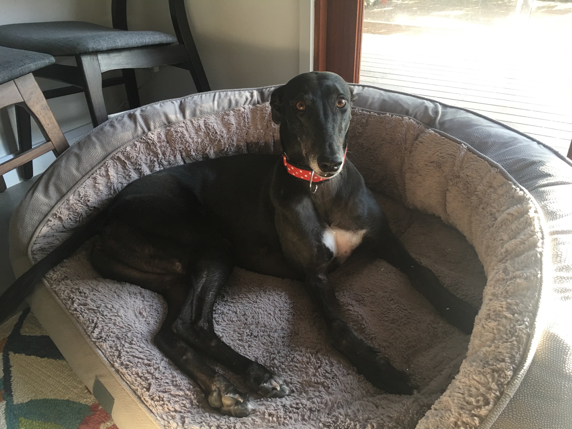 Dogs are pack animals and Greyhounds, in particular, are very familiar with being surrounded by other dogs in their racing kennel environment. For this reason, when left alone without people or other dogs for company, they can be prone to separation anxiety which can manifest in destructive and/or noisy behaviour. Yes, they may "grow out" of it after a few weeks in their new home, but why put the dog through that stress to ultimately live all day alone, while everyone is at work? As a result we do not rehome dogs into households where they are left on their own for more than 4 hours per day, without either people or another dog for company.