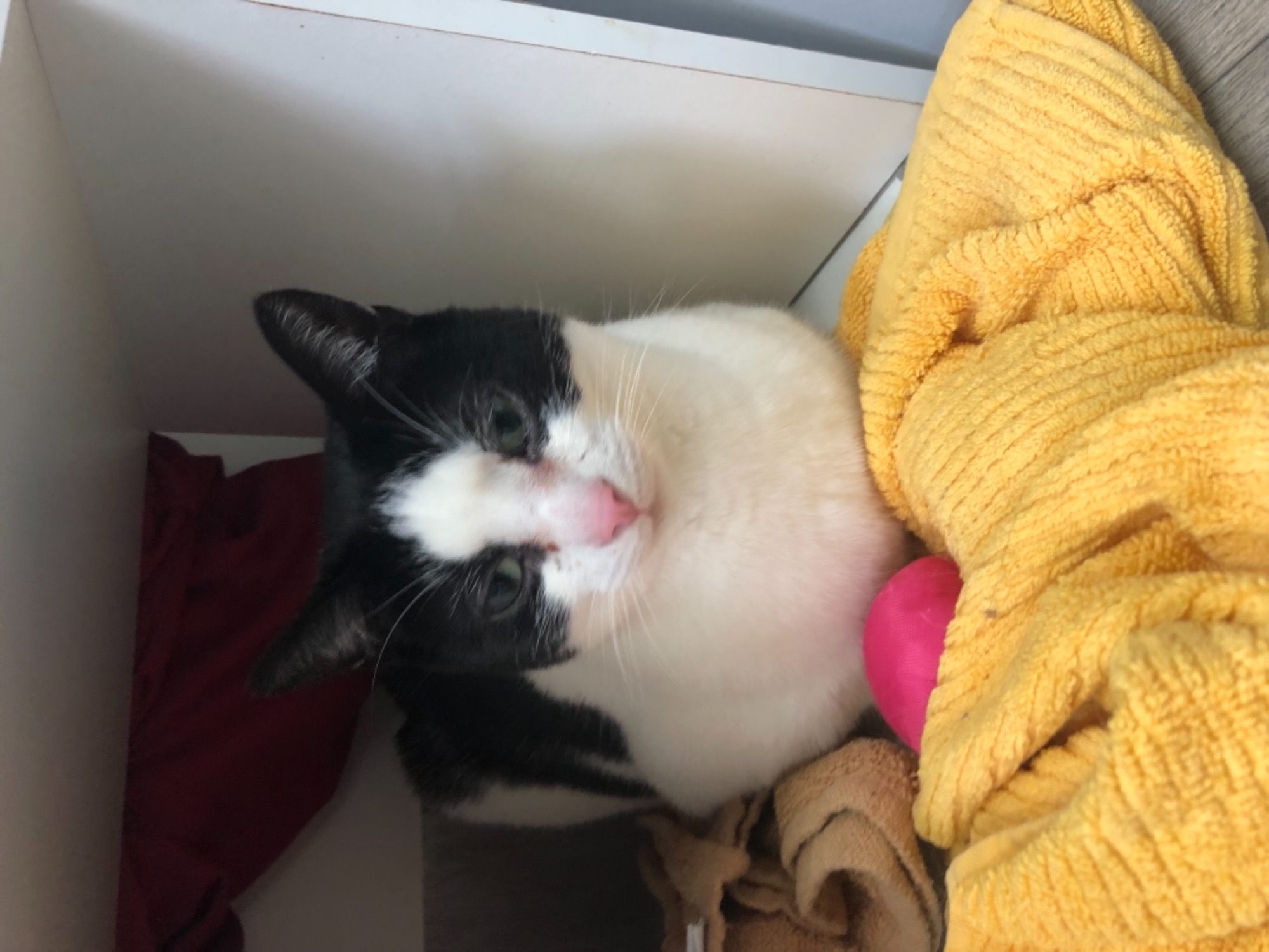 Ryder is a sweet boy who likes a chin scratch and a cuddle. He is a bit of a face-hugger and will happily knead your lap as he gets comfy. You will never nap alone again with this tuxie sweetheart in your life! He is a quiet boy until the cat nip is out! Then he’s super playful. He gets shaky tail when he greets you and will happily fall asleep on your shoulder.