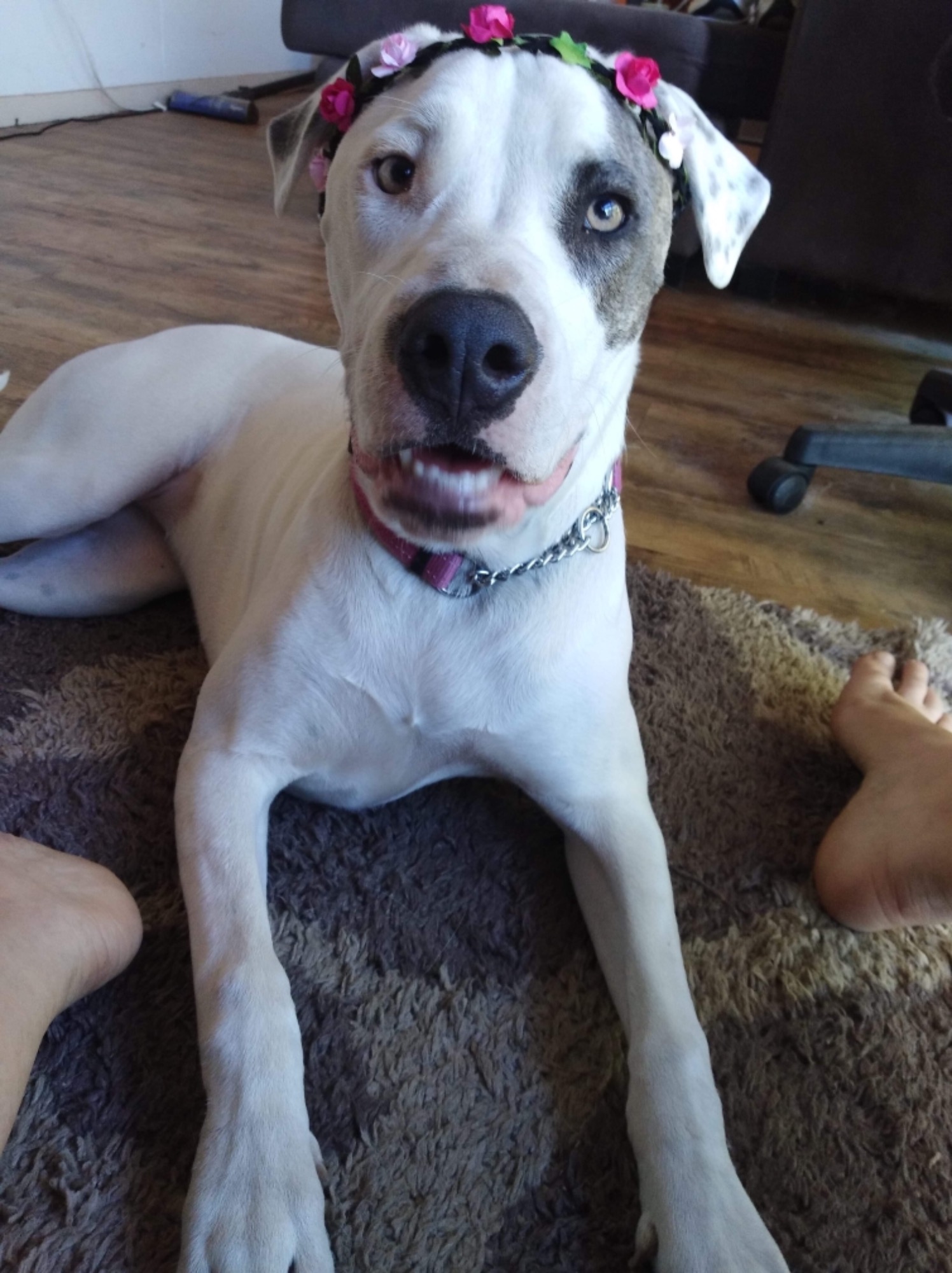 I get into occasional mischief but mostly with gutting my stuffies and running in the house but don’t worry I never chew anything but my toys. I love any and all kids but I’m a bit clumsy so my Foster mom says older ones work best so I don’t knock them over with my long legs and waggedy tail. I am a couch smuggler so would love a spot next to you in the evenings. I'll even snuggle you all night if you’re keen!