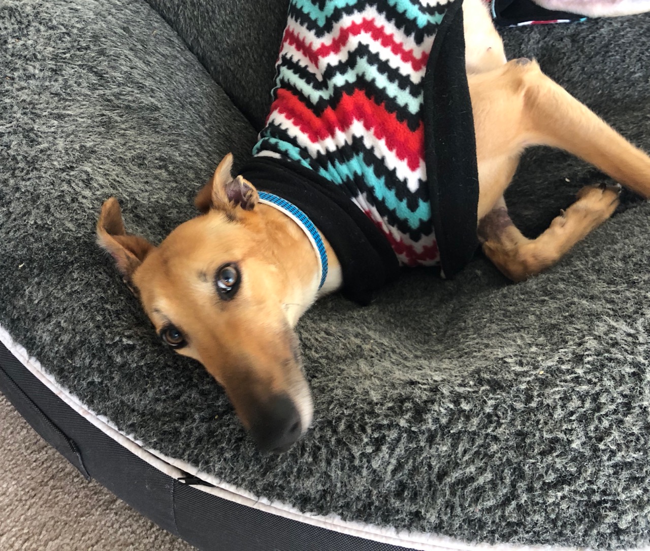 She has a cheeky, mischievous personality and is always seeking to learn more about this adoption caper. Indeed, she’s settled in well, is fine with small dogs and children and loves plonking herself down at cafes for a bite and a pat. That said, she’d probably prefer a house with another dog.