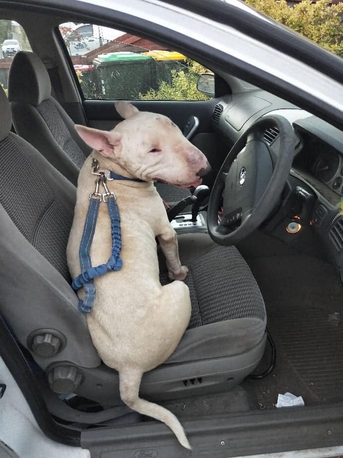 He loves a car ride as you can see from his photo. He adore going on a walk, he does tend to walk across the front of you but using a balance harness that we will supply this can be rectified.