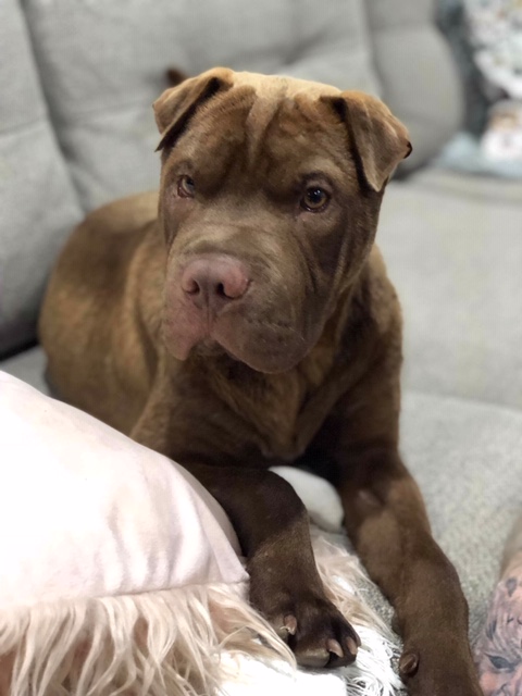 Kingston is an 8 month old Sharpei cross boy and his foster ma says he is the cuddliest little man with the sweetest temperament even when he steals her socks because she forgot to put his toys out .