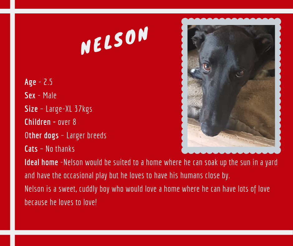 If you have some room on your couch and in your heart for this giant bundle of love or if you would like to find out more about Nelson, please send an email to hello@greyhoundconnections.com.au or enquire via our website/FB page.