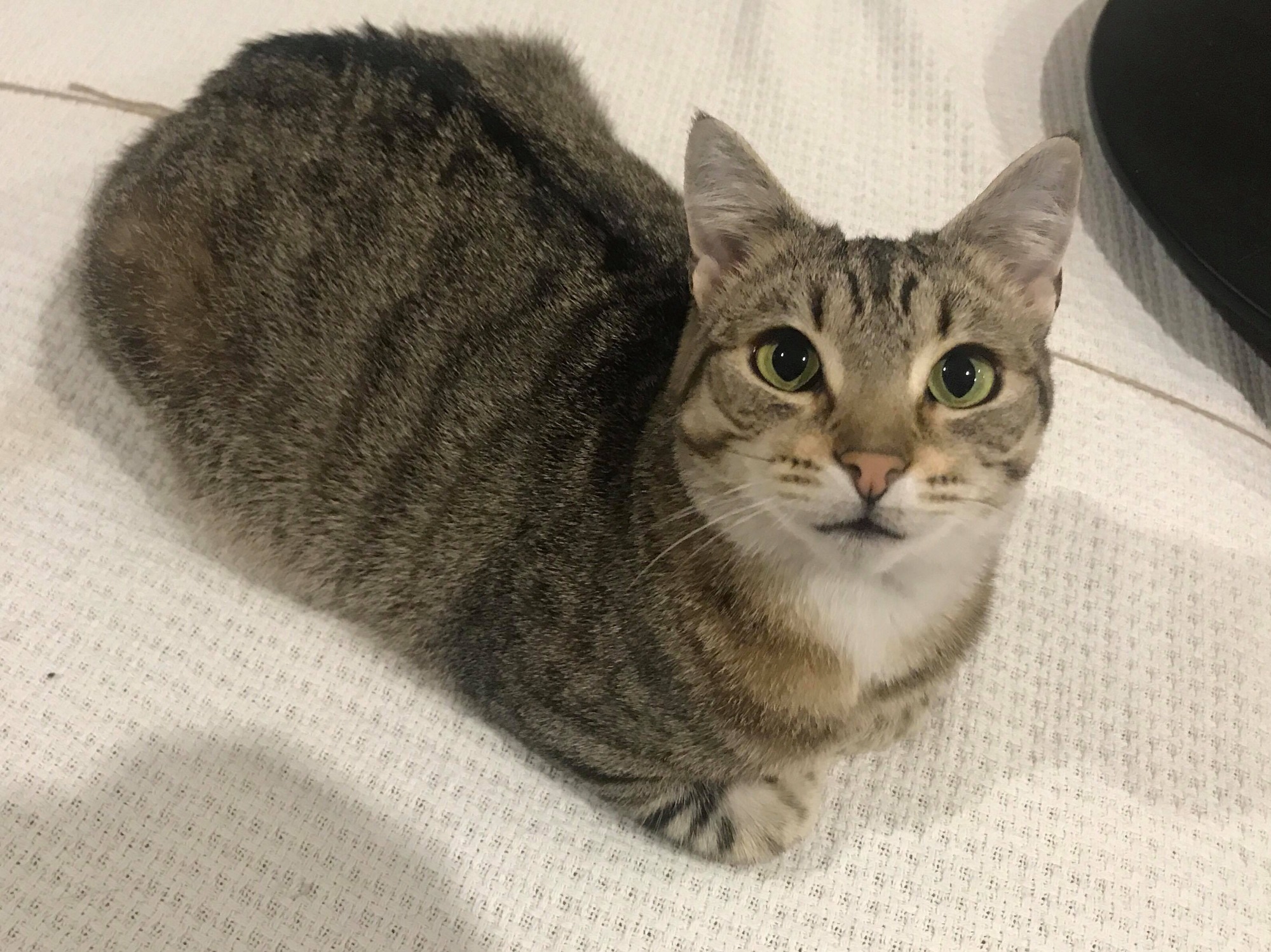 Buttons is a shy but highly intelligent cat who has learned that “yum yum yum” means meal time and “kiss kiss” means touching your finger with her nose. She enjoys eating treats from your hand.