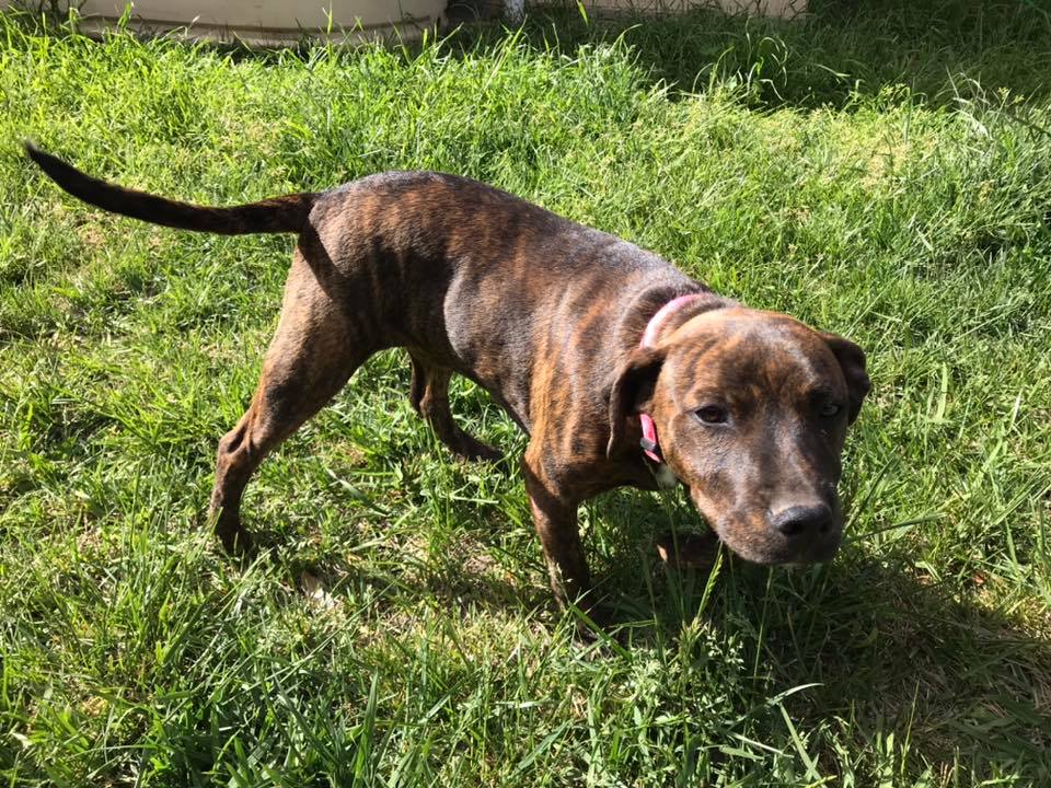 Margie is a sweet 5mth old staffy x girl who was dumped with her 6 siblings when they were 5 weeks old. Margie has the most beautiful nature, she's a bit timid with new people and situations, but once she warms up she loves you with her whole being. Margie is very smoochy and loves nothing more than snuggling on the couch and bed if you let her. She loves to be near her people but also likes to laze about in the sun and play with her toys. Margie is great with other dogs and loves a good game of chase. She would benefit from having someone home or another doggie companion to keep her company.