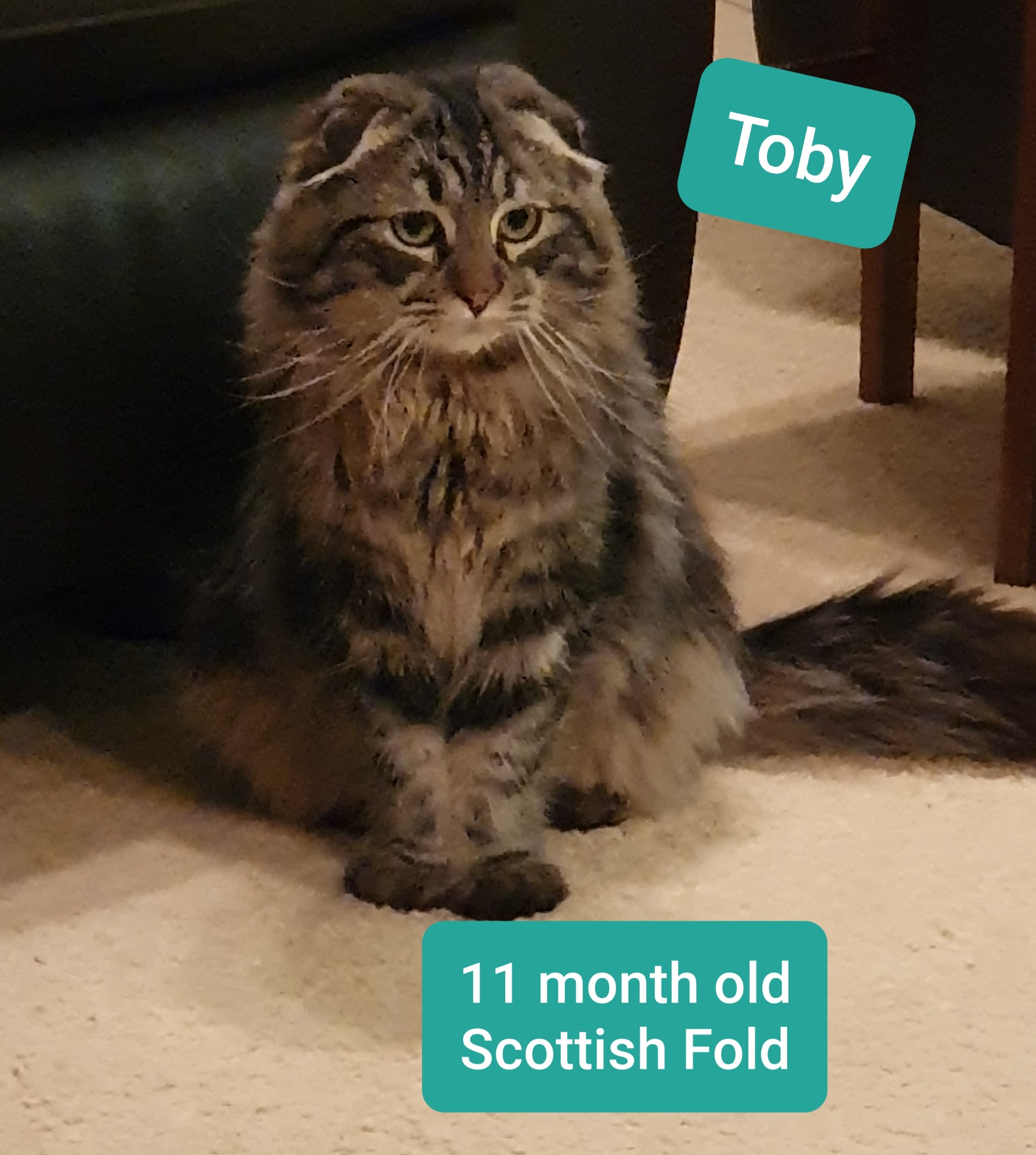 Toby is an 11 month old long hair tabby Scottish Fold who is a total smooch. This fellow is simply devine (note: foster carers getting attached but their full and can't have any more cats 😜).