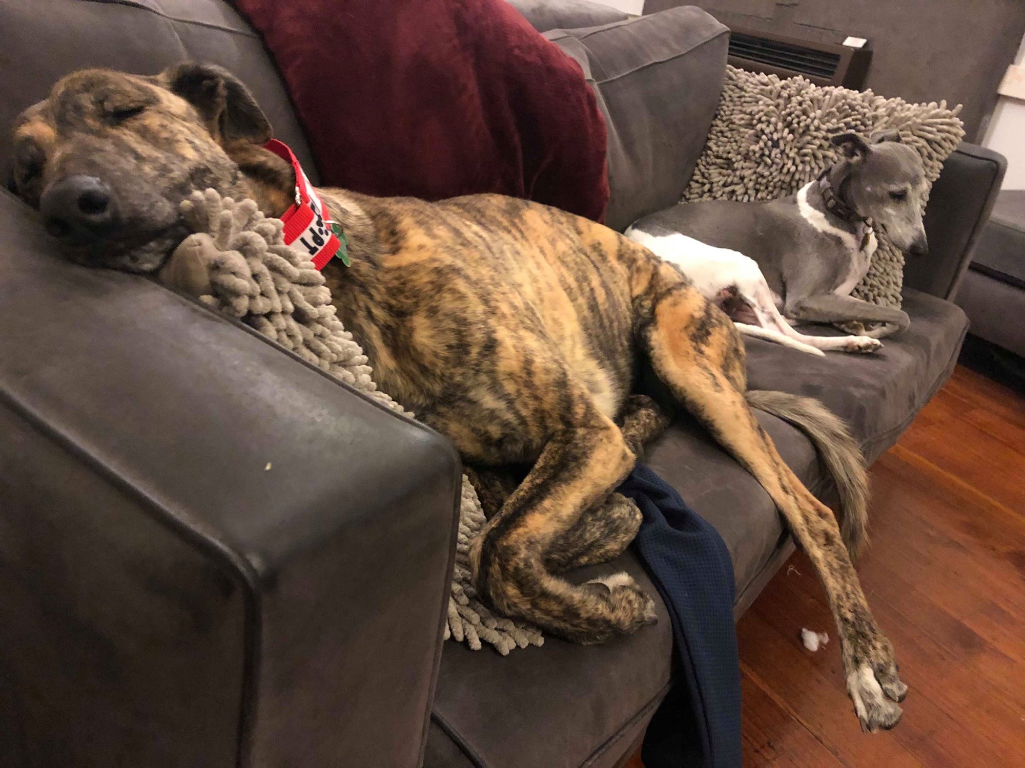 Dogs are pack animals and Greyhounds, in particular, are very familiar with being surrounded by other dogs in their racing kennel environment. For this reason, when left alone without people or other dogs for company, they can be prone to separation anxiety which can manifest in destructive and/or noisy behaviour. Yes, they may "grow out" of it after a few weeks in their new home, but why put the dog through that stress to ultimately live all day alone, while everyone is at work? As a result we do not rehome dogs into households where they are left on their own for more than 4 hours per day, without either people or another dog for company.