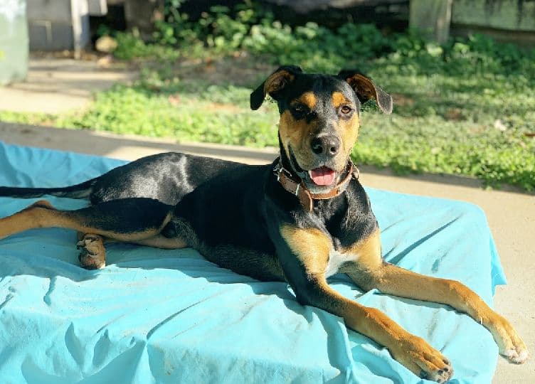 Finn has heart-stopping good looks, accented by his white and black toenails. Finn is big into feeling cozy. Finn likes to get right up in your business and know what you are doing. Wants to sit on your lap and give big slobbery kisses. When he’s not being nosy, he enjoys his long walks. He likes a running partner even better. Finn is very clever. If his foster mum and dad go inside he gets on his back legs and peers through every window he can and tries to find an entry point around the house to join them. At night time he sleeps right beside his foster mum and dad and needs to be very close. Finn loves other dogs. He had a very unique run and is very agile with his jumping. Finn is an absolute gem