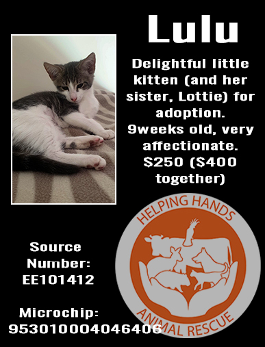 Lulu is up for adoption on her own or with her sister, Lottie. (See https://www.petrescue.com.au/listings/75723)