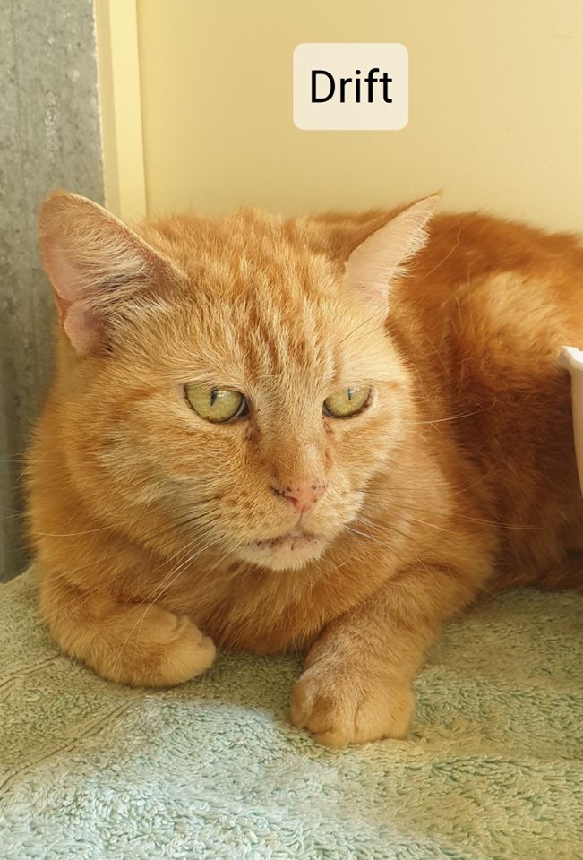 Drift is a big hunk of ginger man cat. He is a new addition to the Refuge, so we are still getting to know him. However, he seems very easy going, and enjoys pats and attention. He is currently sharing a pen with Chicko and Trig, and seems to get along with them ok.