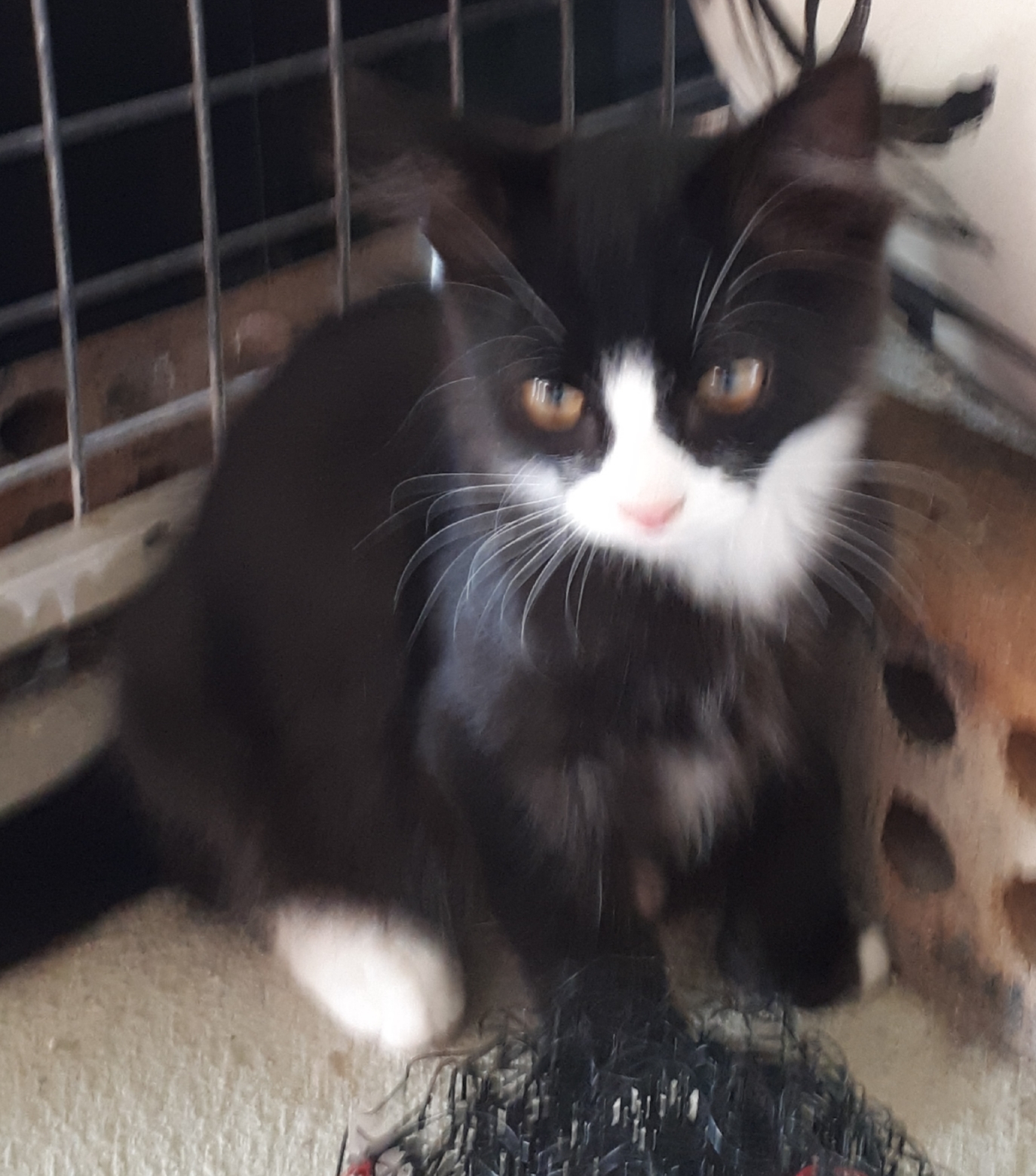 Black and white tux male quite friendly will make a wonderful fur family is litter trained eats any food.