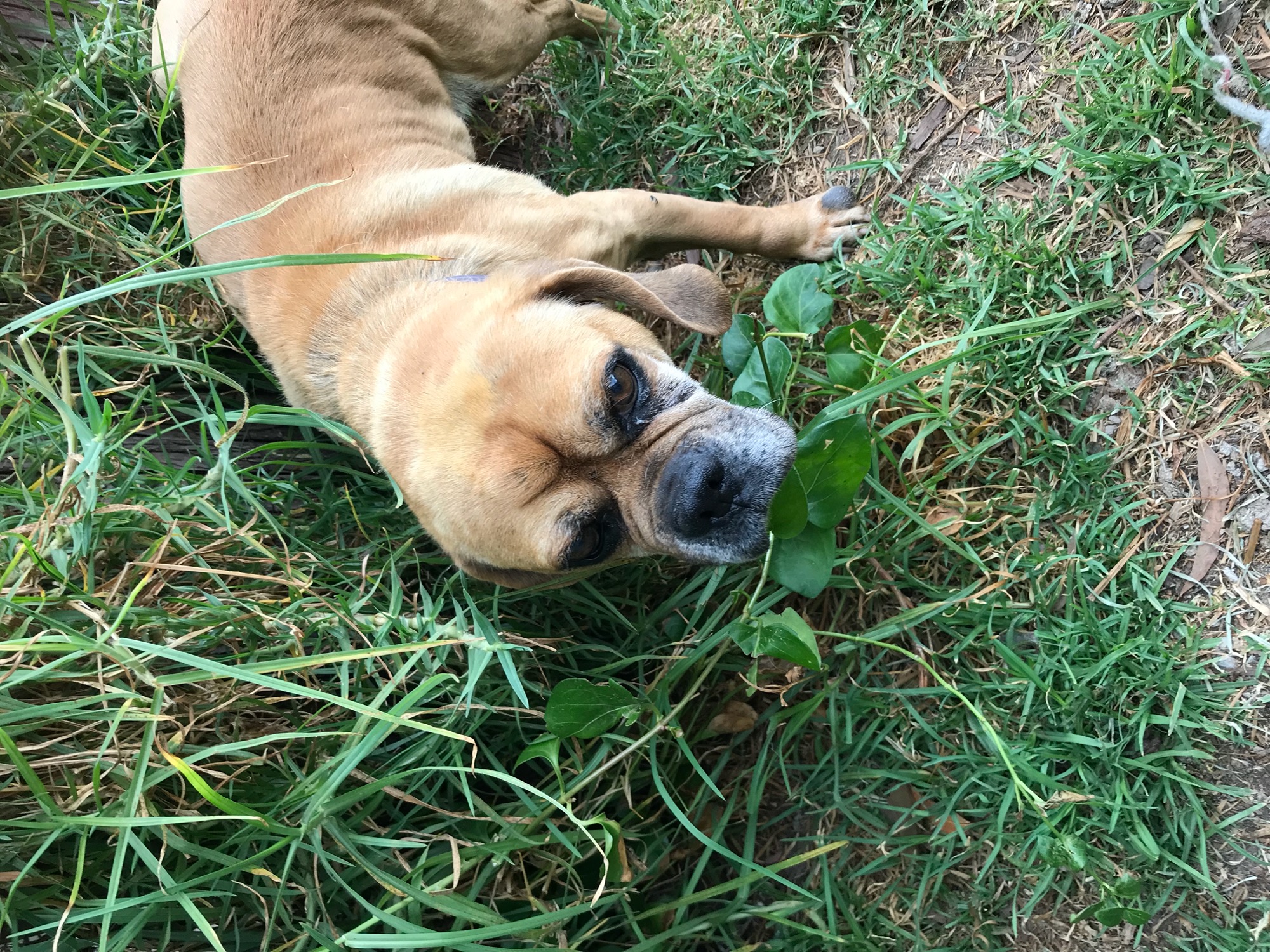 His beagle side has him actively following his nose...chasing every scent it picks up & hoping to see what is around the next corner. His pug parentage makes him fun loving, affectionate & a joy to have around.