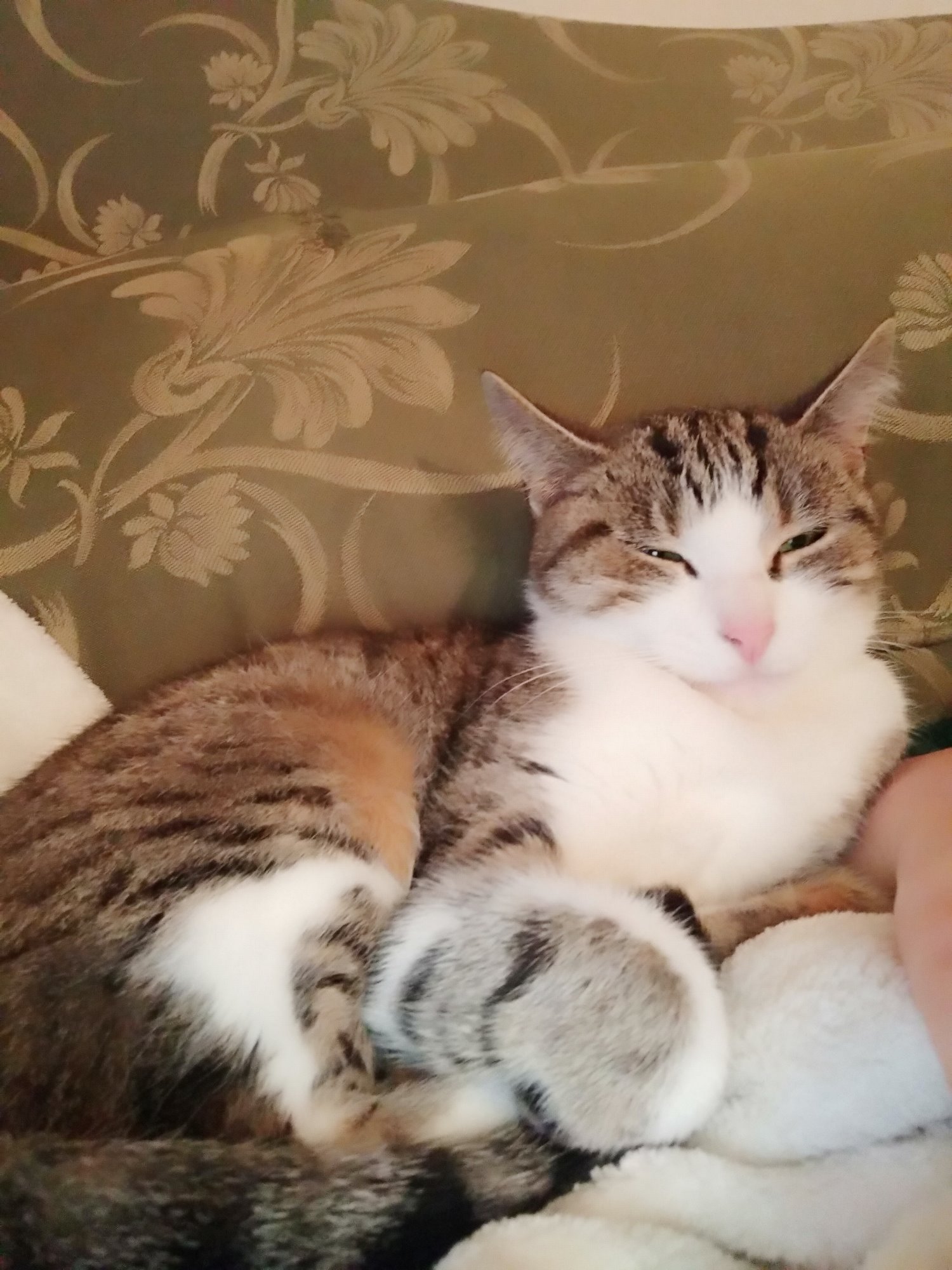 Emily is the sweetest little snuggle puss. She loves getting under the covers in bed for a cuddle and loves being close to humans. She’ll come down the hallway to greet you when you get home.