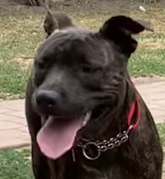 English cross AmStaff with a beautiful brindle coat and stunning hazel eyes.