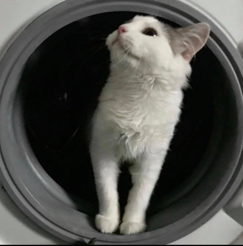 Cotton Ball is very happy to be hugged and cuddled, and has a lovely purr which comes out multiple times a day. She likes to sleep on the desk next to you while you work at the computer, or to sleep surrounded by blankets on the couch. In the morning sun, she’ll roll around and stretch, showing her adorable white belly.