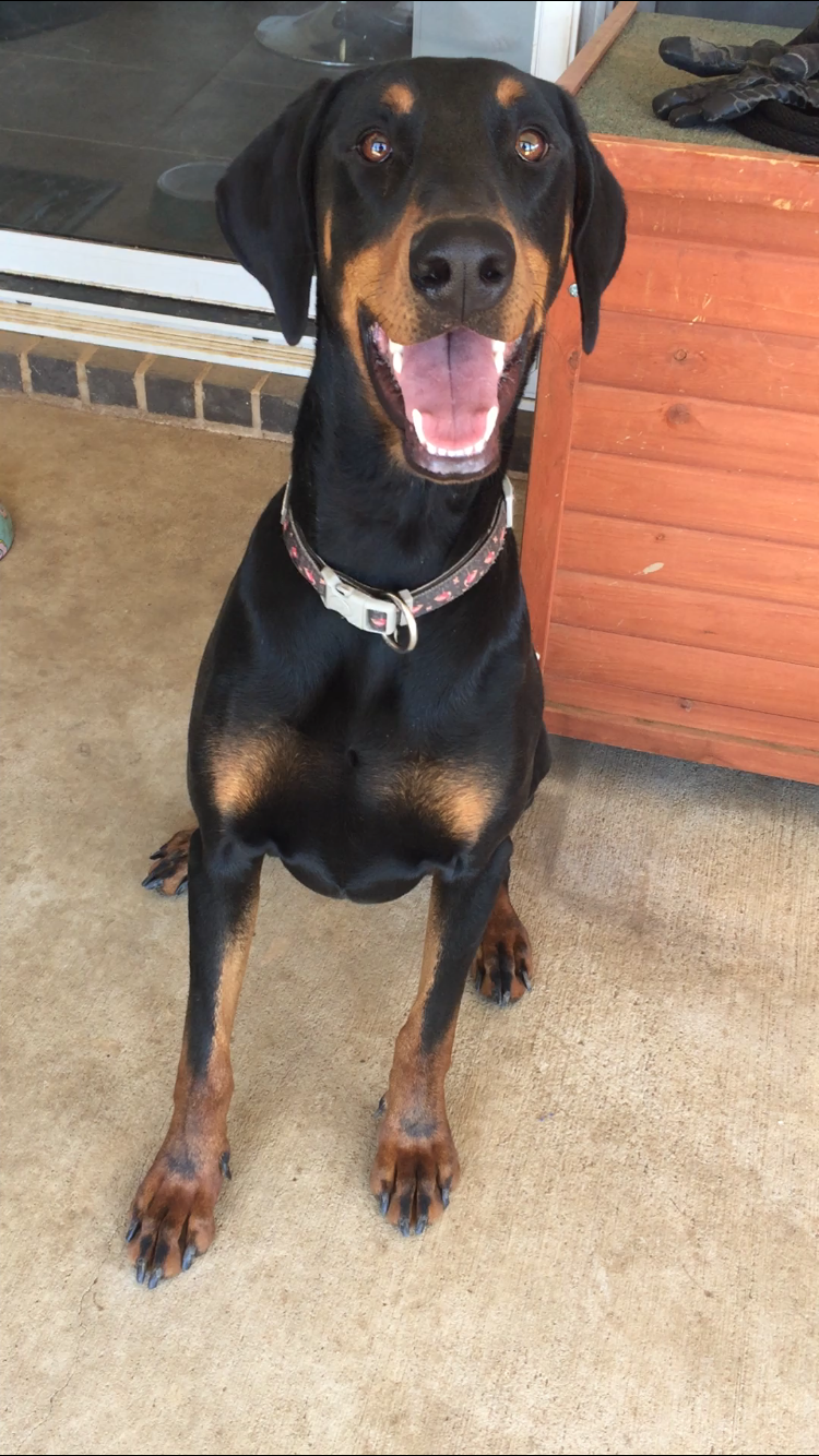 He is an outside/inside boy, while fine outside he would need to sleep inside at night. He'll find his feet fast in a new environment typical to 18-month-old Dobermanns.