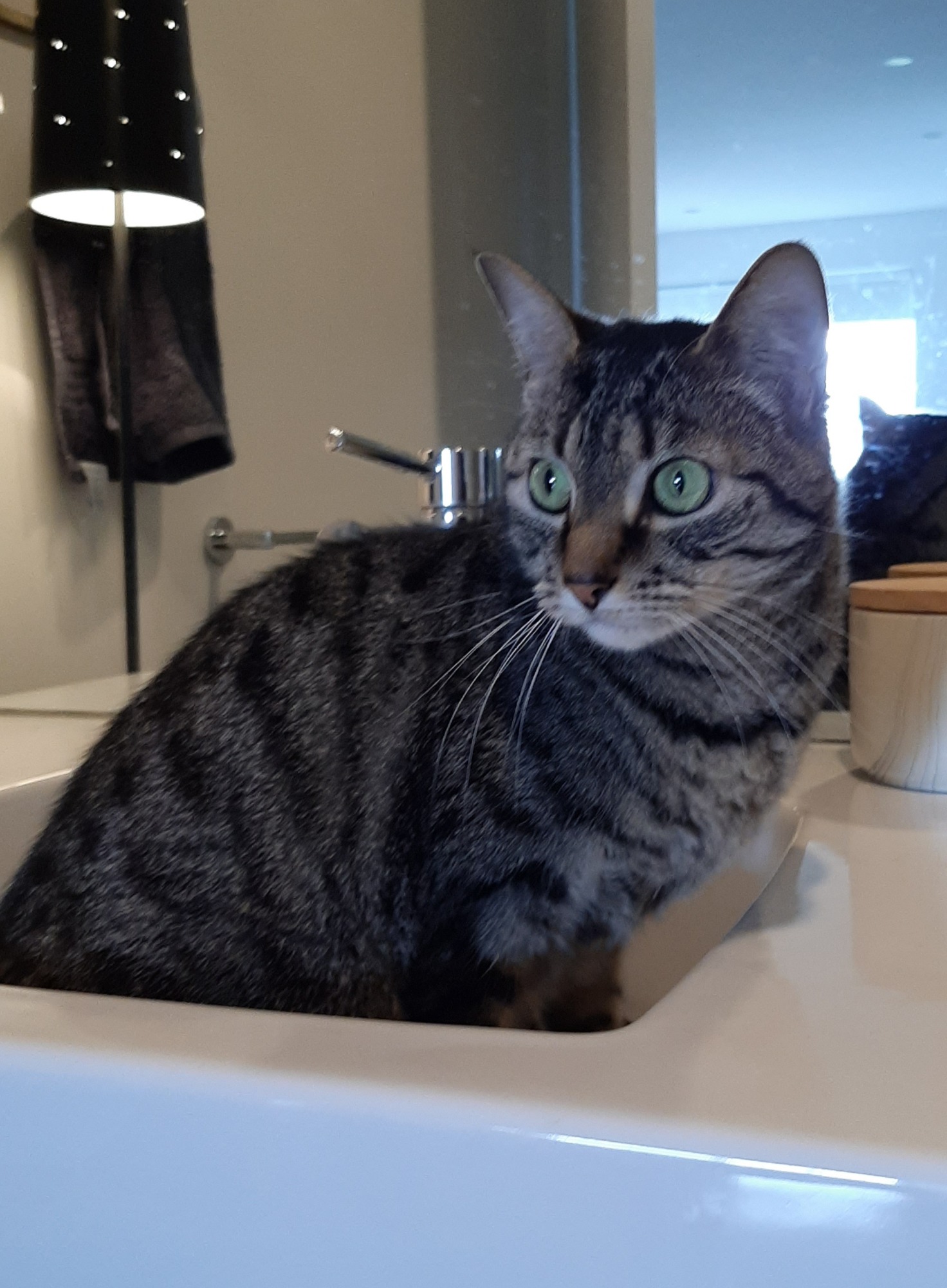 Nacho is very demonstrative in her affection for humans. If you put your hand out, she'll headbutt it. She will also rub up against your feet if they're nearby. She has a cute little meow, and a sweet demeanor. She's a little shy initially, but then once she sees you're friendly she's super smoochy! She to loves brush against your legs. Nacho also likes to play with a laser pointer, but she's also happy to just chill, sometimes in the bathroom sink.