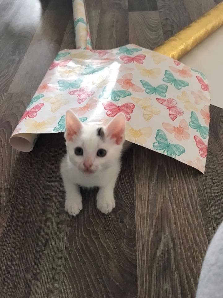 Because of his carefree nature and white fur he needs a strictly indoor only home for his whole life, not just while he’s a kitten. A shaded outdoor enclosure is also acceptable but white kitties like him aren’t allowed to sunbake!