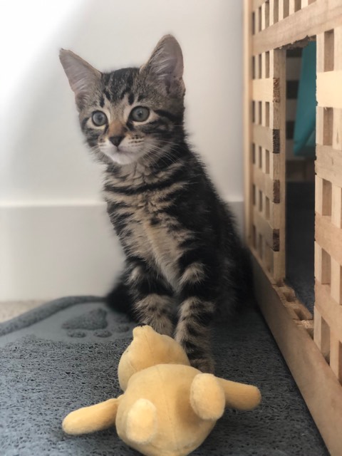 Juliette (Juju) is the classic brown tabby girl. As soon as she is picked up she starts to purr. Juliette was found wandering the streets and then came into rescue. Juliette (Juju) is a sweet, loving and friendly girl who loves human company and delights in any toy around.