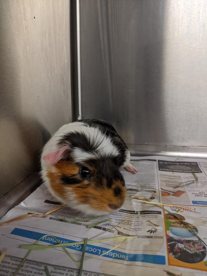 Larry, Curly and Mo were brought into our clinic after their previous owner decided they were a bit to much work. We separated Larry from the ladies, as we didn't want any pregnancy, and had him desexed. After the 3 week separation we tried to put him back in with his lady friends but it turns out he's not the most well mannered man and he stressed them out. So it's a solo existence for this man until he meets another pig who'll stand up for themselves. Larry is a shorthair tricolour guinea pig and he's about 6 months old.