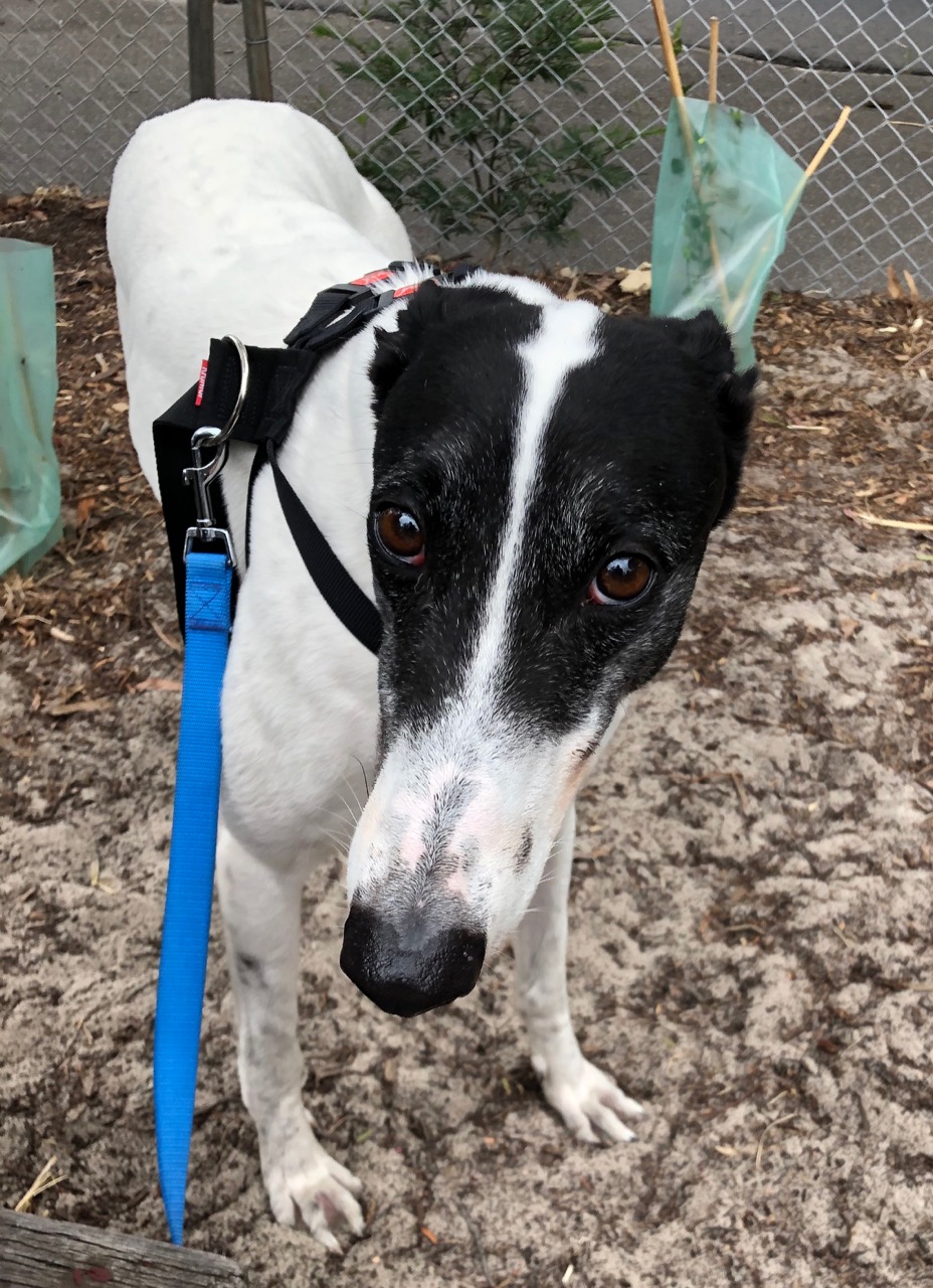 Freddie gets on well with dogs of all sizes and breeds and would ideally love to live with another hound, maybe a confident girl who can be in charge. He had a nasty fall in his final race but has recovered well, is learning quickly and has an abundance of love to give.