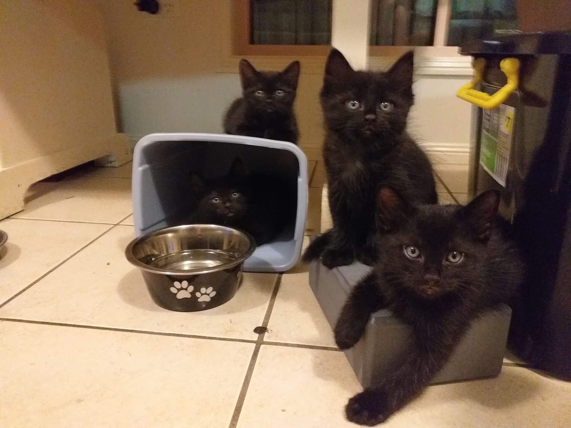 Kuro and her siblings Schwartz and Nero are a playful bunch who love running around and playing with each other. They especially love playing with those silly toys dangling on a stick… they are like candy to them. They are eating well and use the litter trays too. They love a good sleep to replenish their energy to play so would be great for a family with kids as they are very friendly and playful. These kittens are very young and this is a great age to bond with a kitten and gain a friend for life. If you are looking for two or even three adorable kittens these guys already love each other and would be great together.