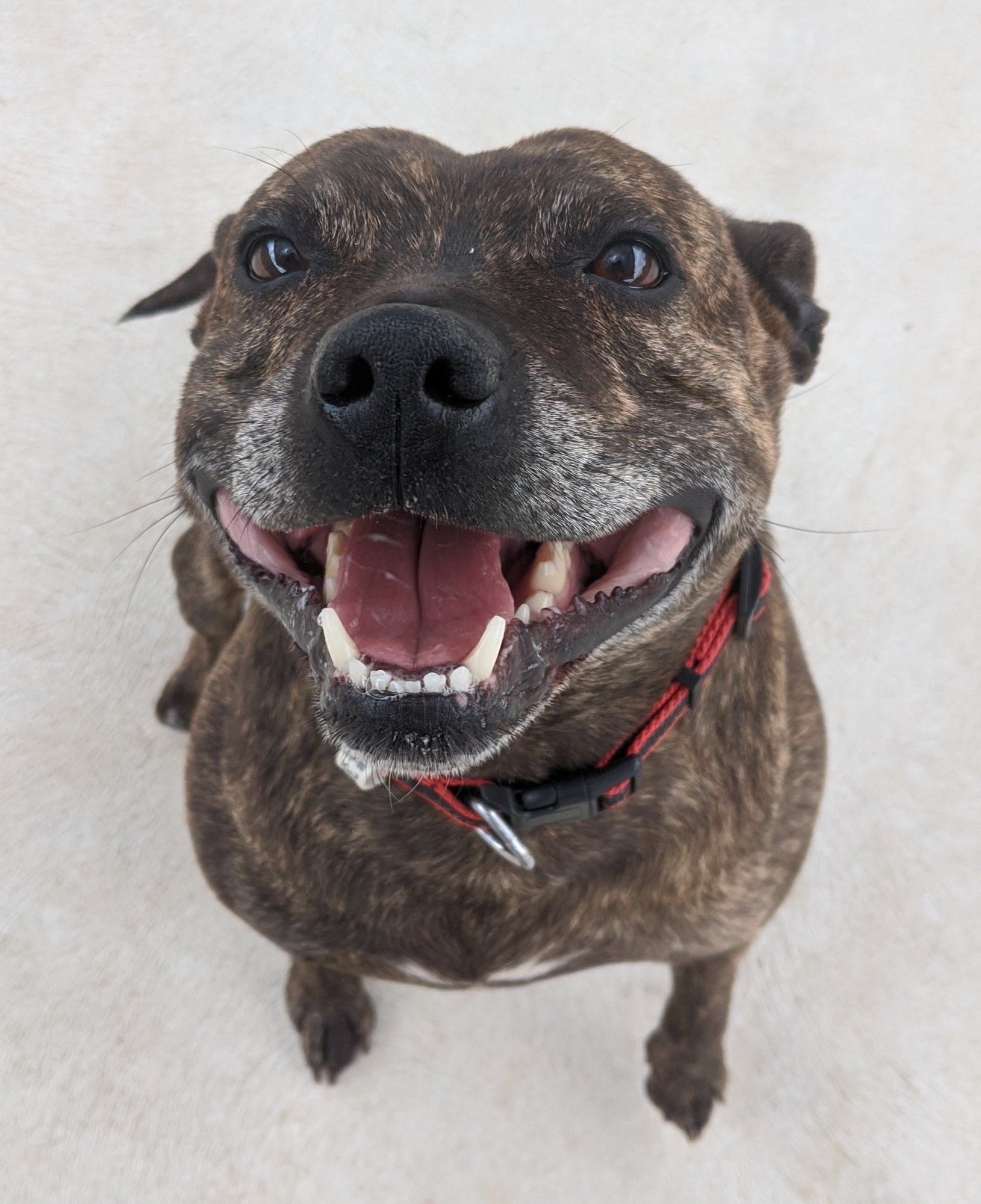 Brutus is a typical happy, friendly staffy that is looking for his forever home. Brutus is confident and sweet with everyone, including other dogs, however he may suit a home with an older or less boisterous dog as he can get a little bit impatient when he is being jumped on. Brutus is missing a paw but this doesn't affect his mobility and he still absolutely loves going for walks. He is obedient and loving and will make an amazing addition to a home looking for an older, loyal lapdog.
