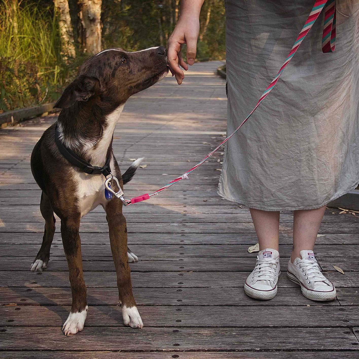 He would best suit a home with an adult dog who he can learn from. Neo loves to lick and is learning to sit and not to jump. Neo would benefit from ongoing training to help him become the most beautiful confident dog he can be. He is still young, but he's a very quick learner. Neo is also new to walking on a lead and can be reactive to other dogs, prams, bikes and people he is unsure of so further time and attention will be a benefit for him.